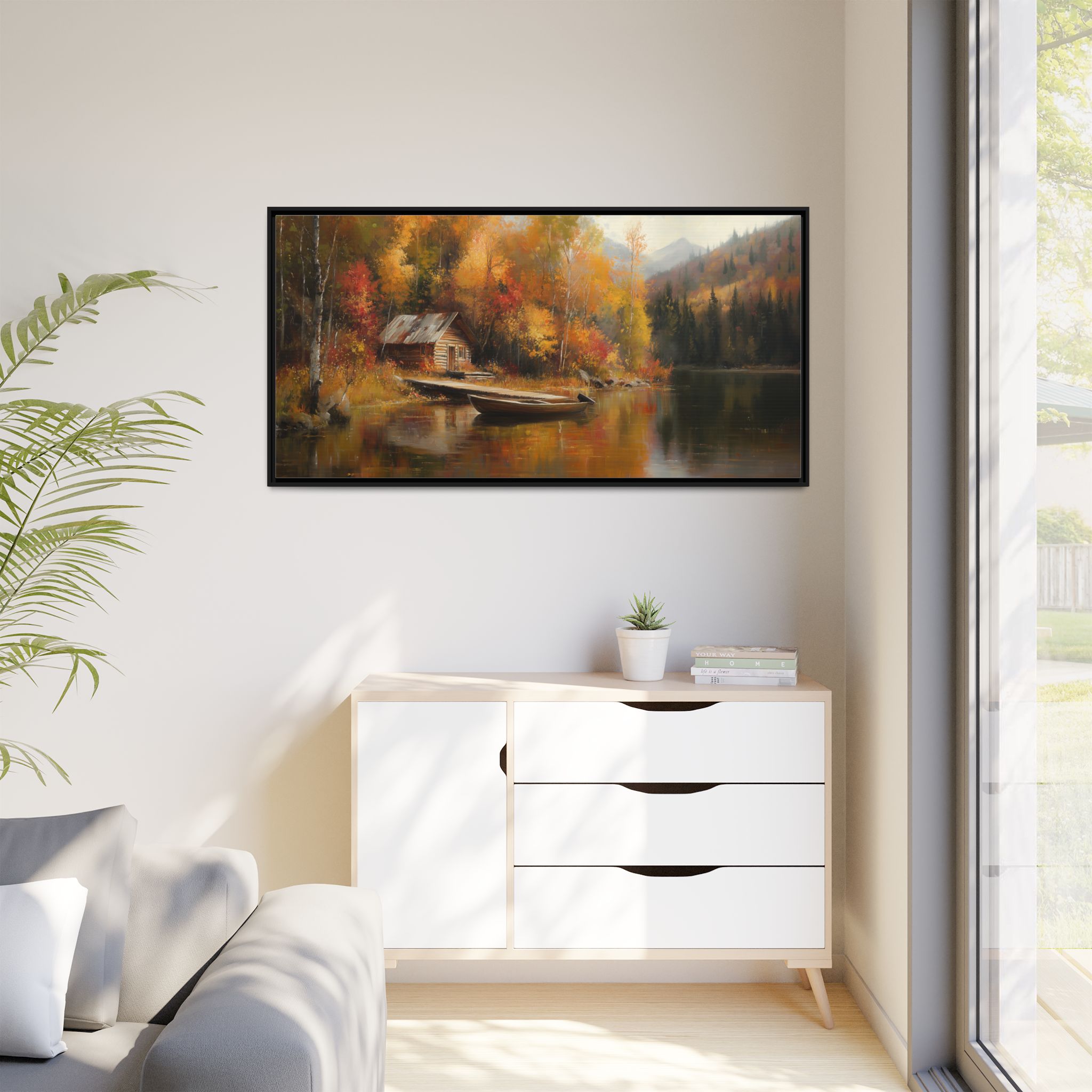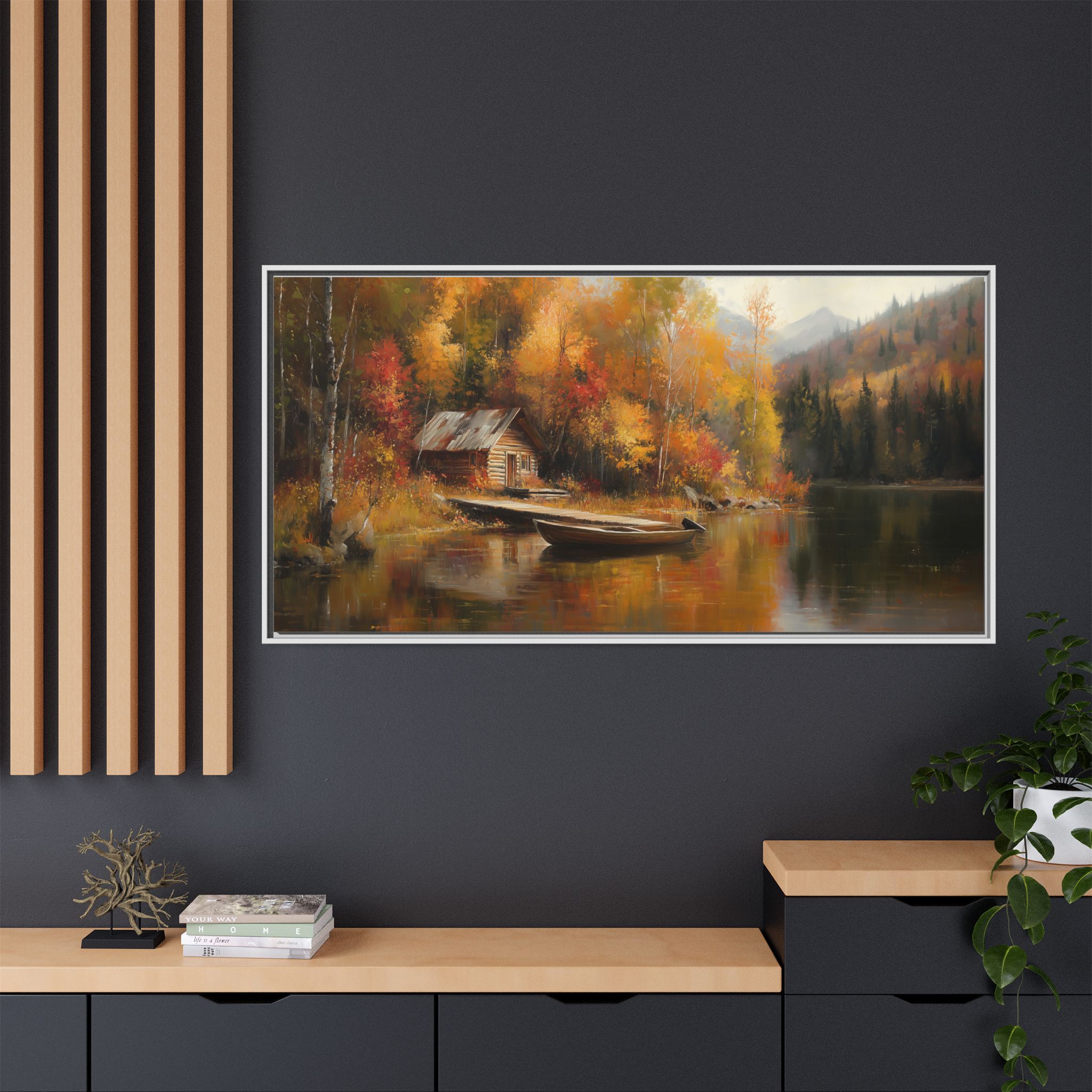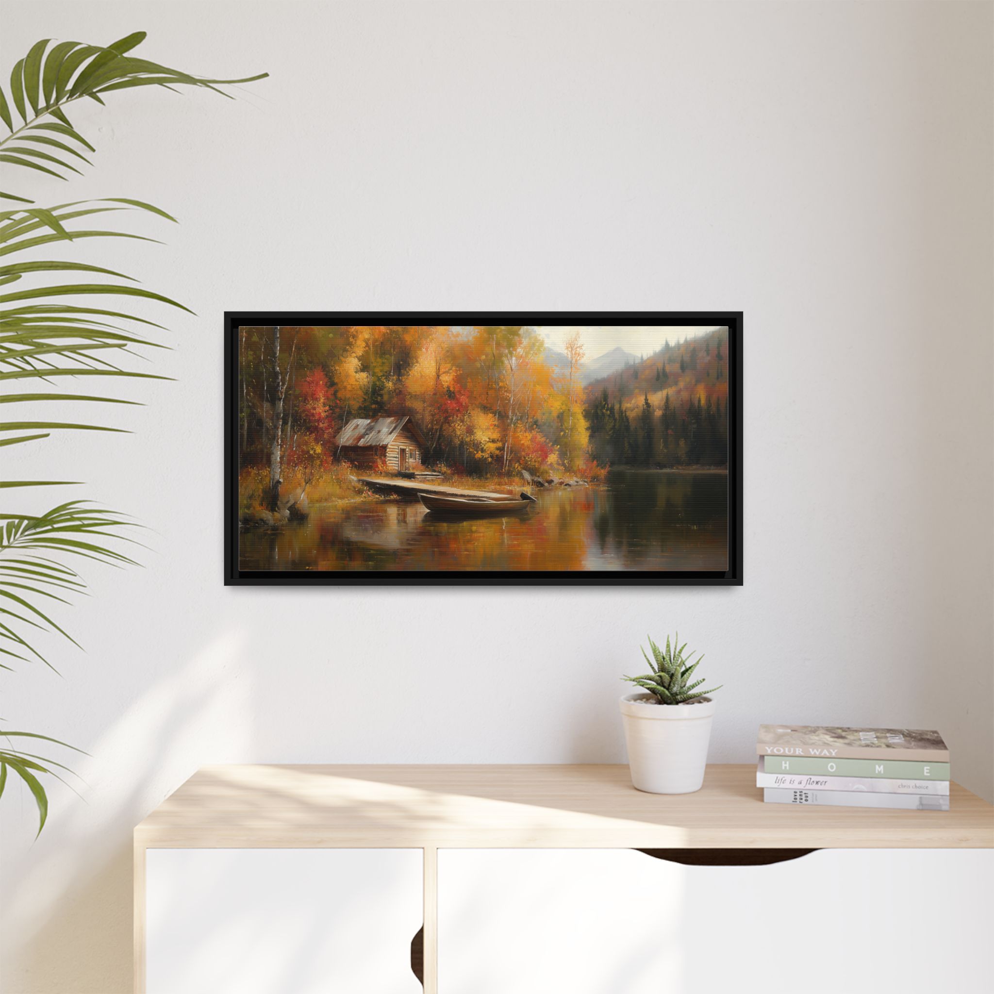 A charming timber cabin nestles along the shore of a mirror-still lake, surrounded by a blazing tapestry of autumn foliage in rich amber, crimson, and gold. The warm glow of late afternoon sunlight sets the entire scene aglow, with vibrant leaves reflecting perfectly in the glassy water. Wispy tendrils of smoke rise from the stone chimney, curling into the crisp autumn air, while a weathered dock extends into the lake, scattered with fallen leaves. The surrounding forest dazzles in seasonal splendor, with sugar maples and oaks in fiery transition against a backdrop of evergreen sentinels.