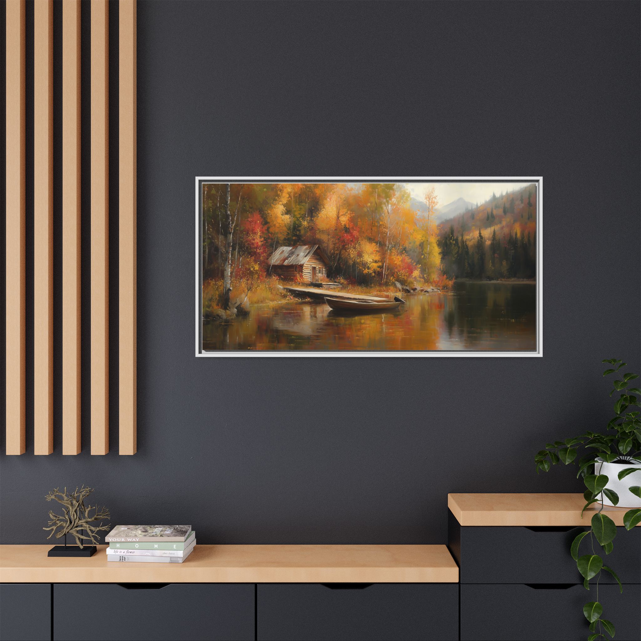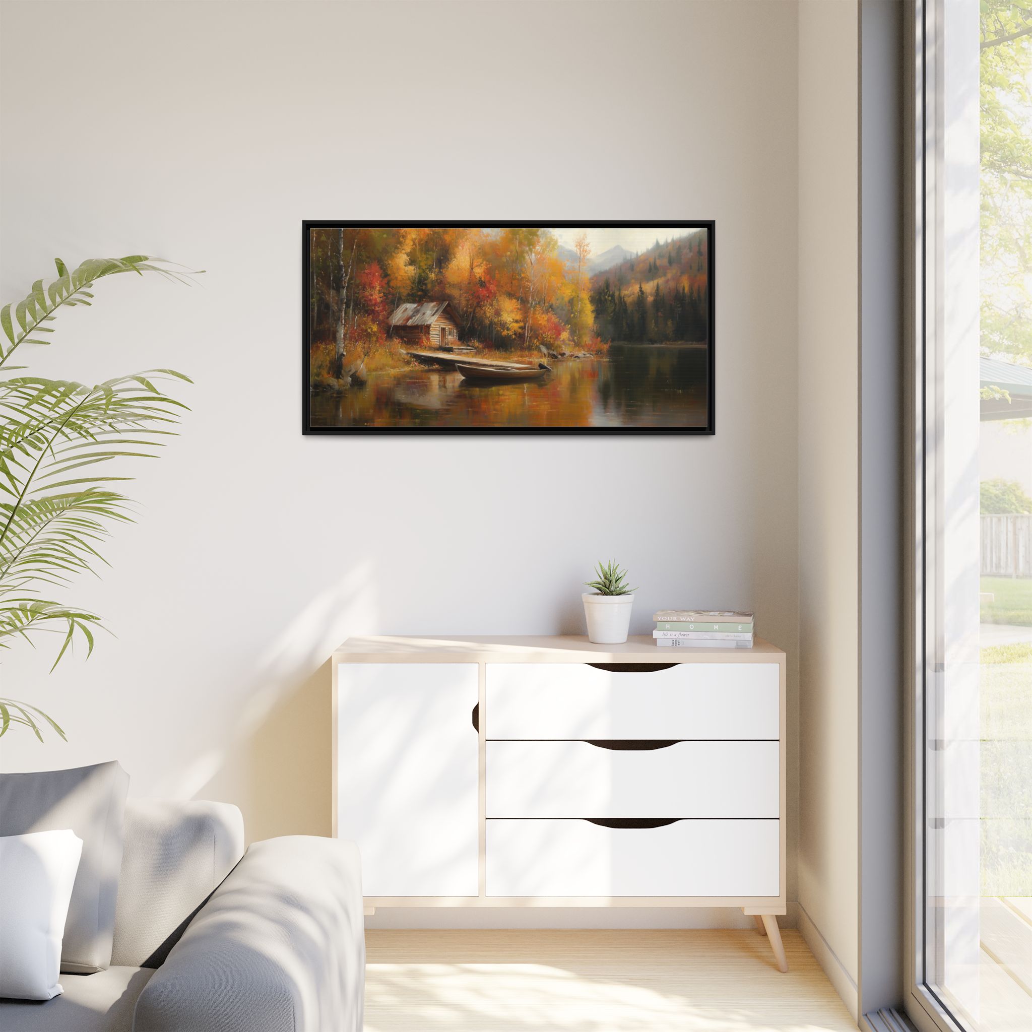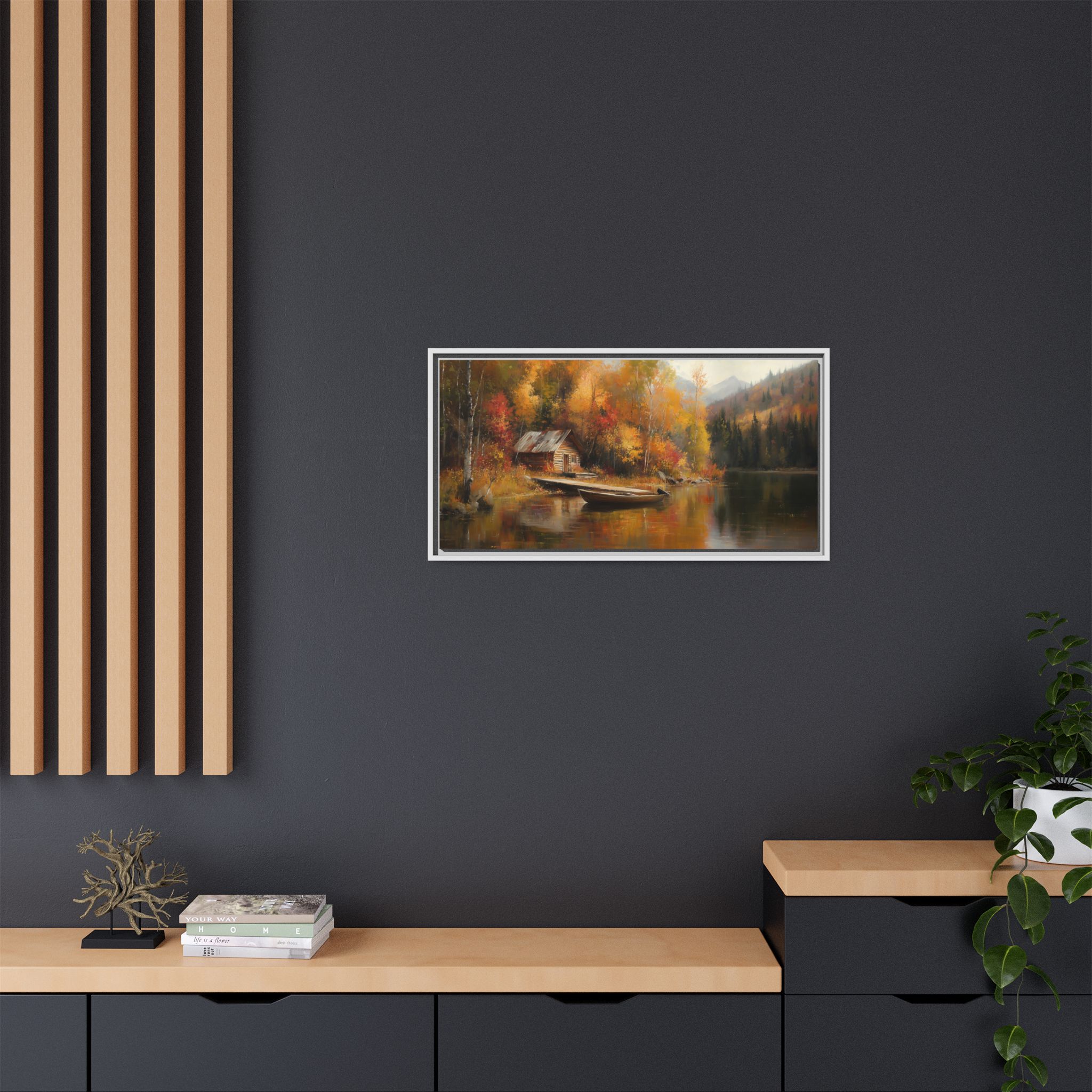 A charming timber cabin nestles along the shore of a mirror-still lake, surrounded by a blazing tapestry of autumn foliage in rich amber, crimson, and gold. The warm glow of late afternoon sunlight sets the entire scene aglow, with vibrant leaves reflecting perfectly in the glassy water. Wispy tendrils of smoke rise from the stone chimney, curling into the crisp autumn air, while a weathered dock extends into the lake, scattered with fallen leaves. The surrounding forest dazzles in seasonal splendor, with sugar maples and oaks in fiery transition against a backdrop of evergreen sentinels.
