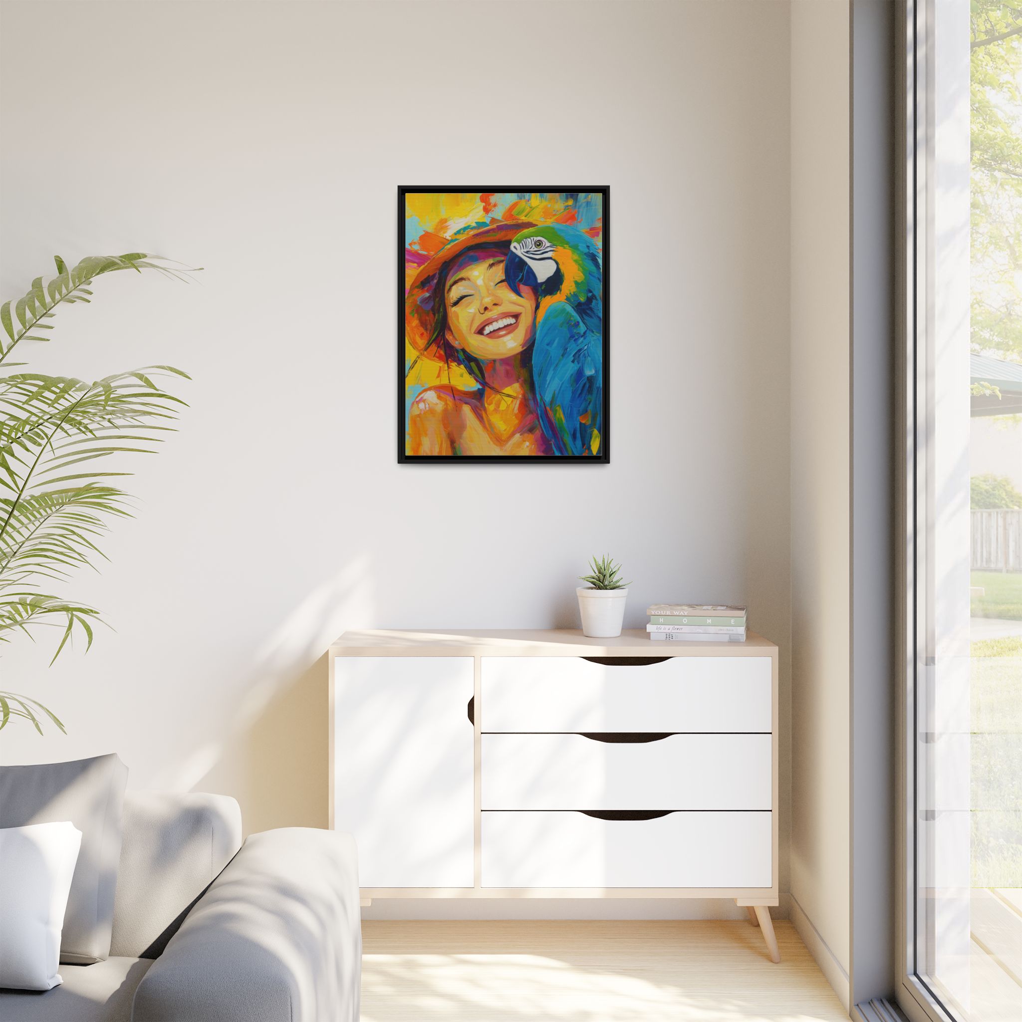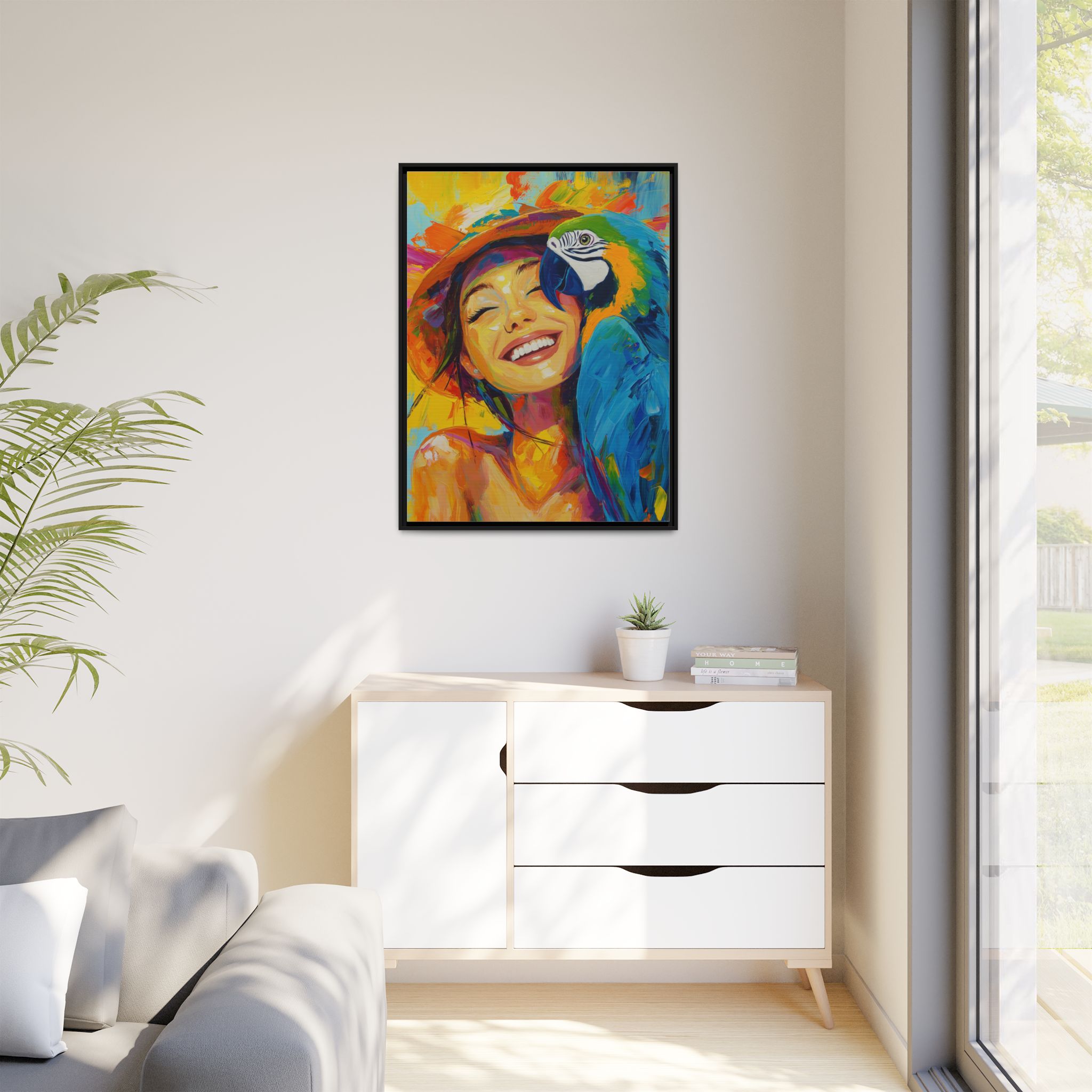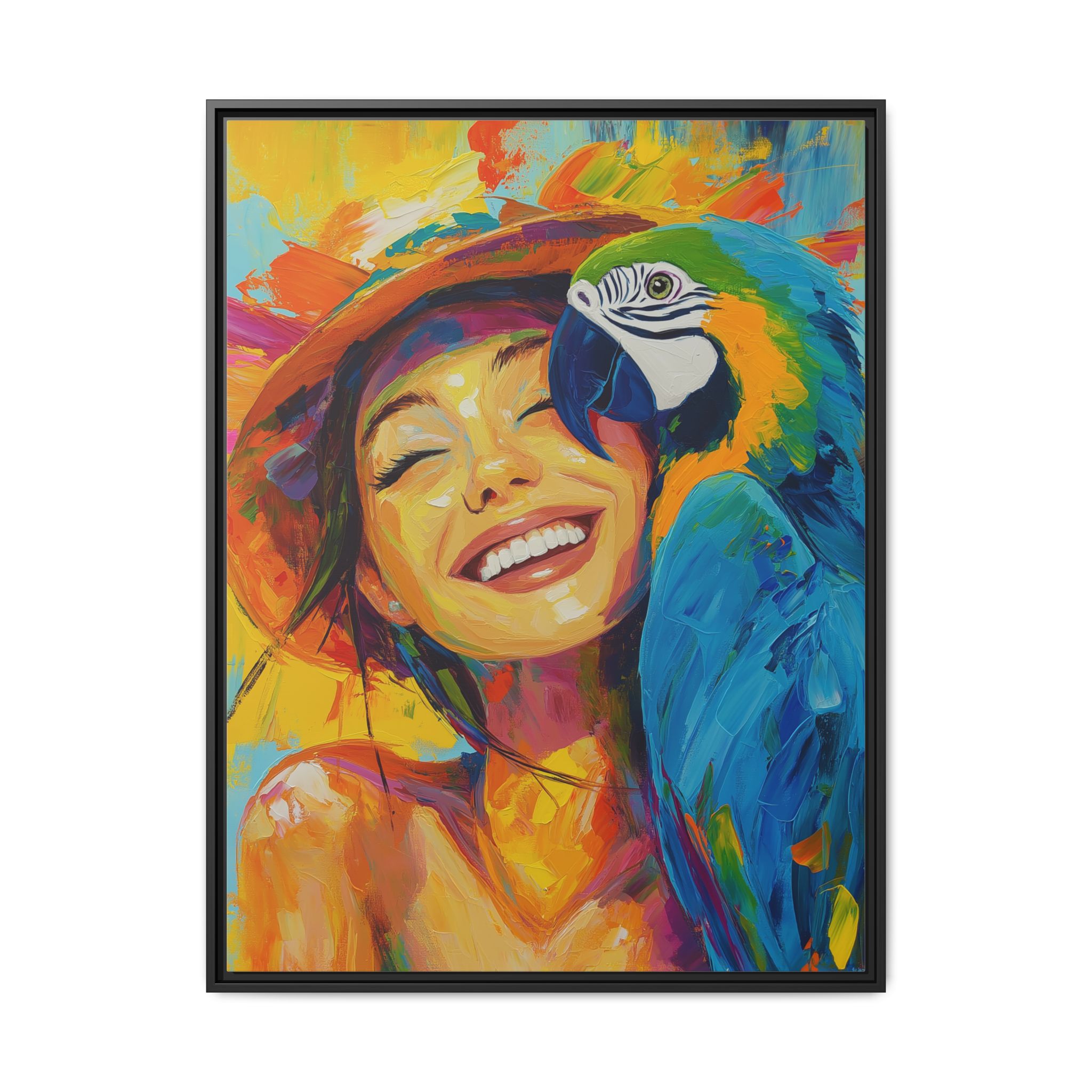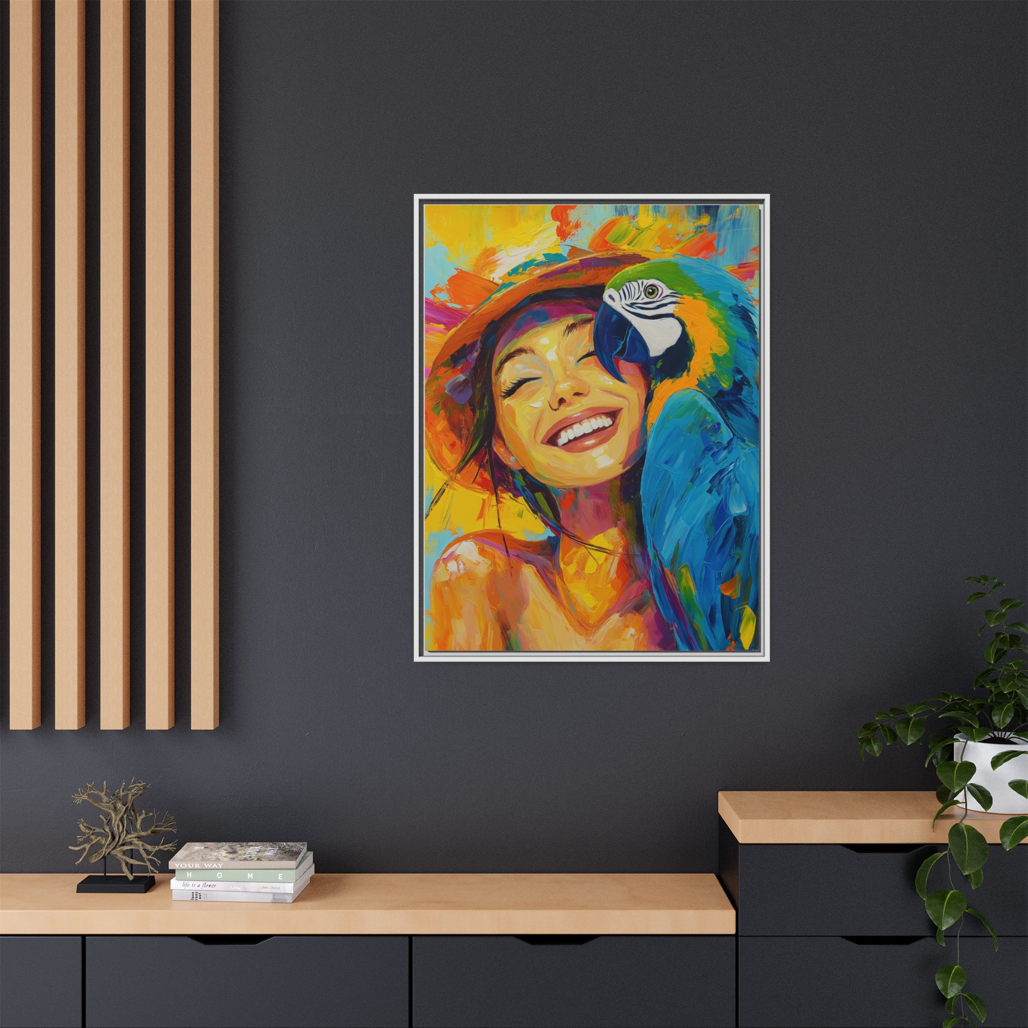 A stunning canvas print featuring a blue parrot and a girl, perfect for adding a touch of whimsy to any room. The vibrant colors and unique coating make it a high-quality piece of art that will brighten up your space. Ideal for animal lovers and those who appreciate colorful, unique decor. Perfect for gifting on birthdays, holidays, or as a special treat for yourself.