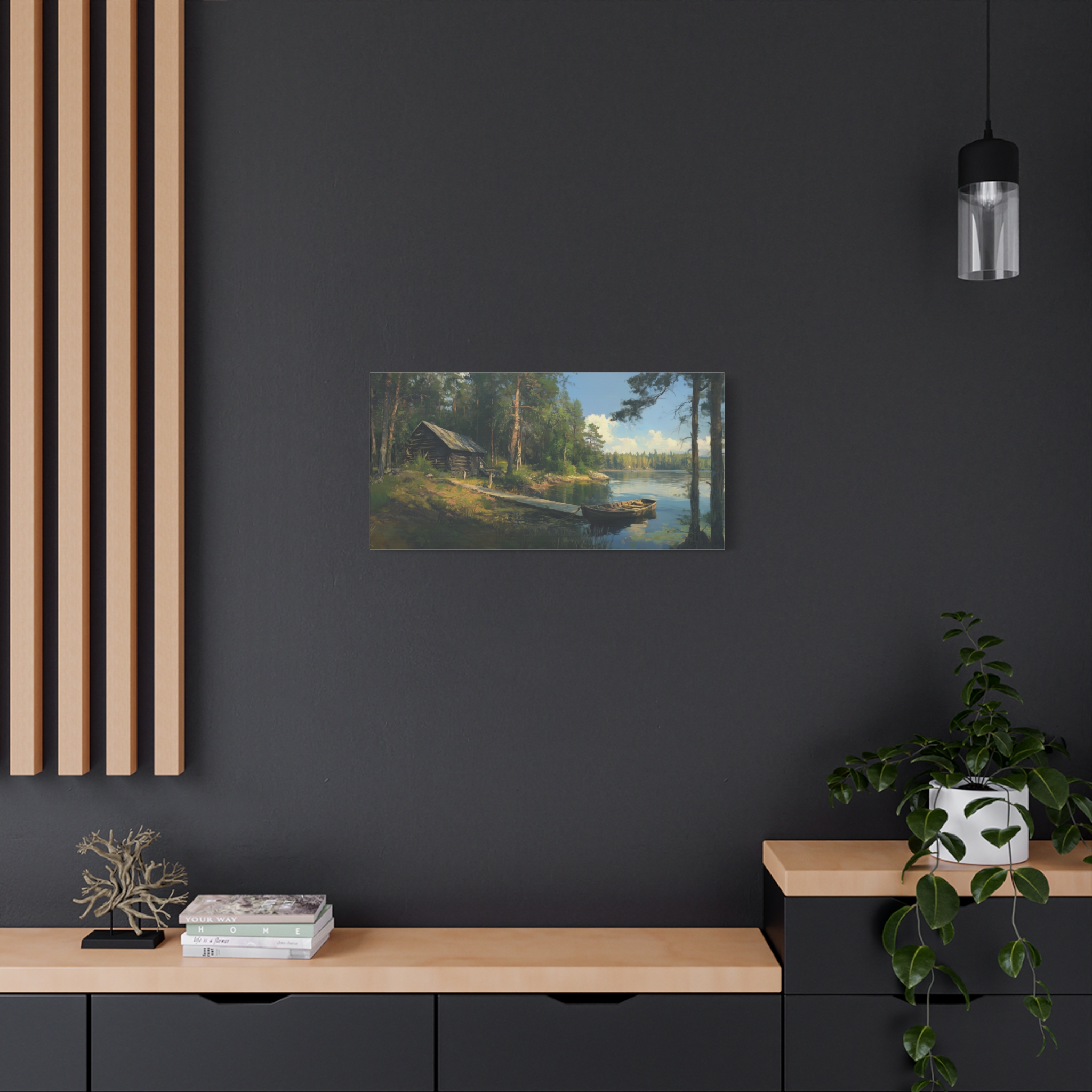 A serene canvas featuring a cabin and boat in green and blue tones, perfect for adding a calming touch to any space. Ideal for nature lovers and those who enjoy coastal themes, this canvas is great for decorating a home or office. Perfect for gifting on special occasions like birthdays, housewarmings, and holidays.