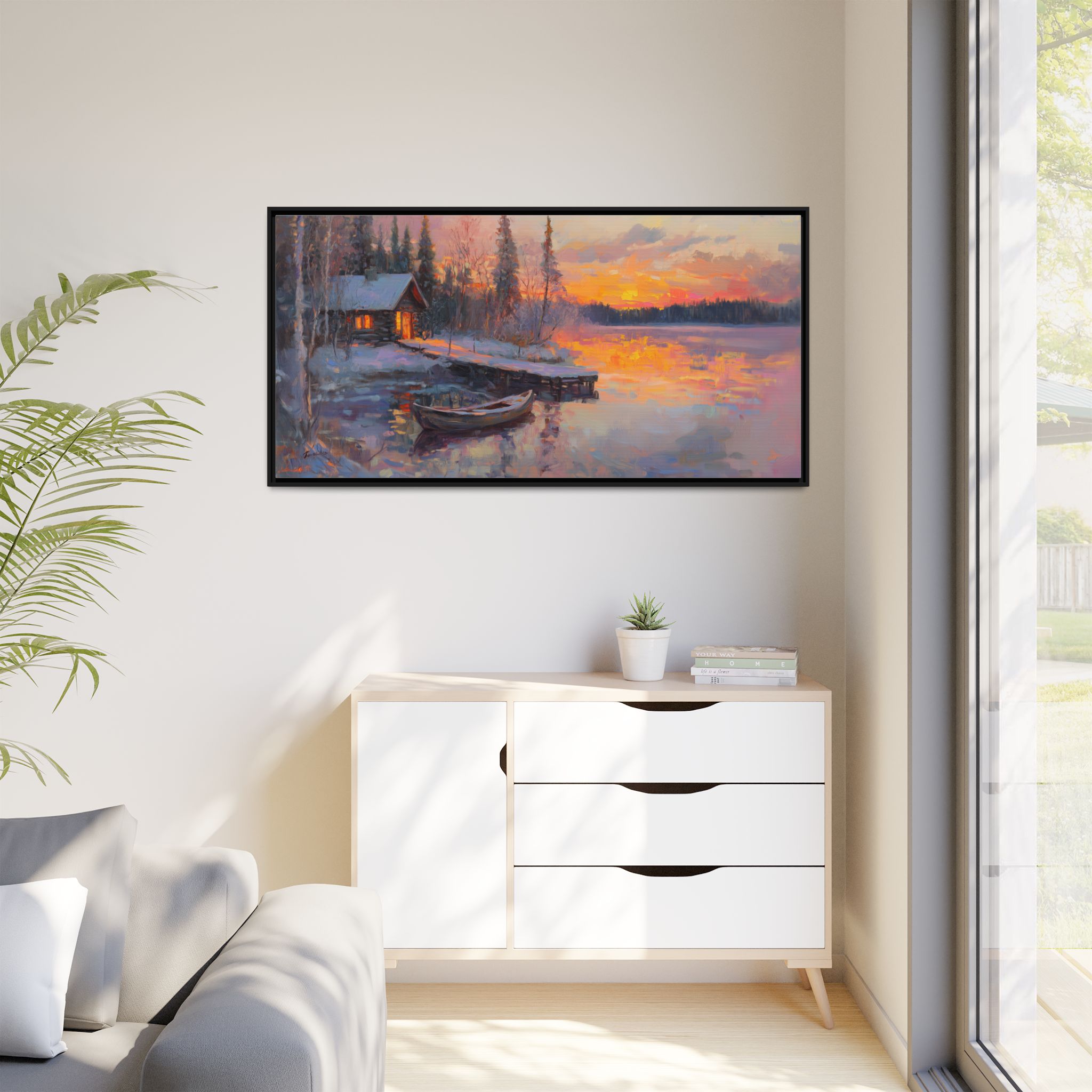 The oil painting "Cabin at Lake in Orange Winter" depicts a solitary wooden cabin nestled along the edge of a frozen lake, bathed in the warm, fiery glow of a winter sunset. The scene is rendered in rich orange, amber, and golden tones, contrasting against cool shadows of snow and ice. Smoke curls from the chimney, suggesting life within, while the stillness of the lake and surrounding bare trees evoke a sense of quiet isolation. The bold, expressive colors transform the winter landscape into a dreamlike vision of warmth amid the cold.