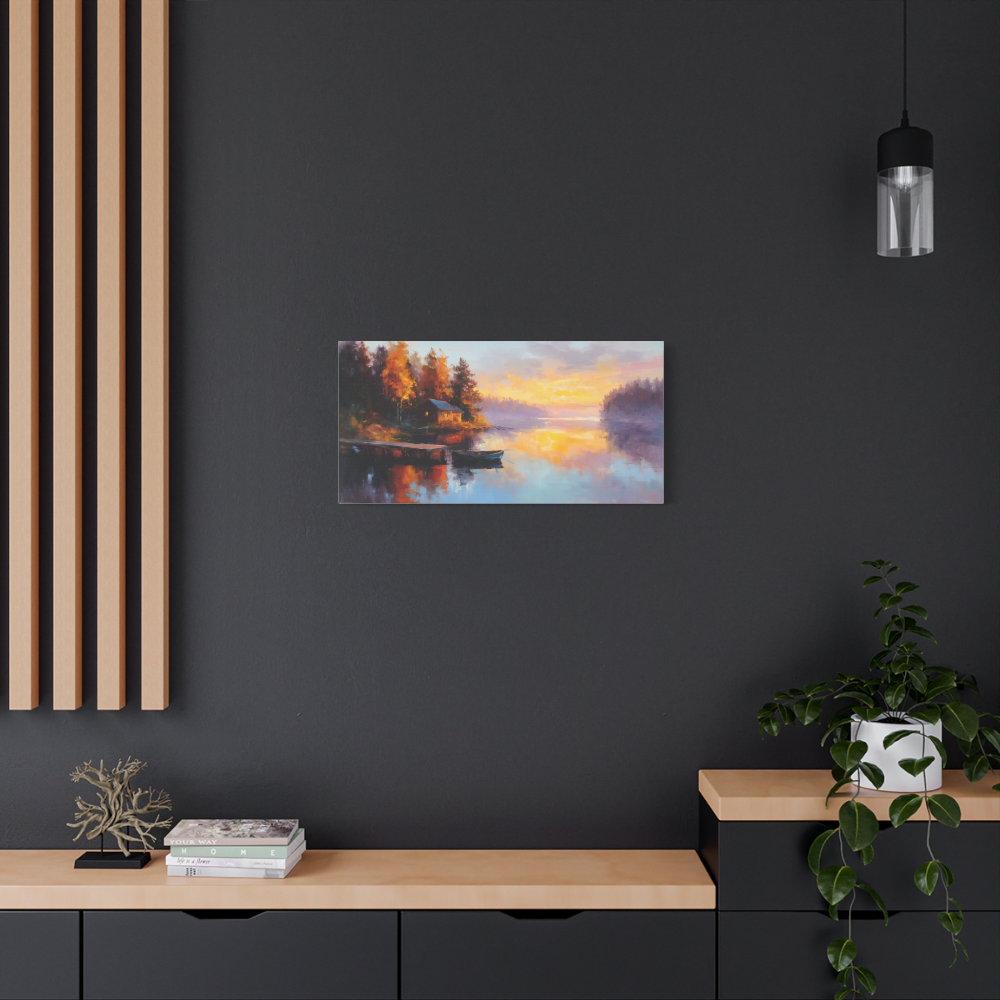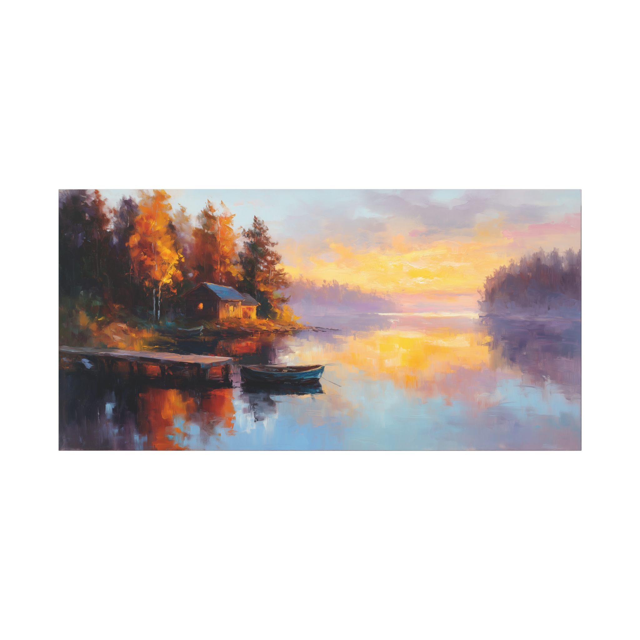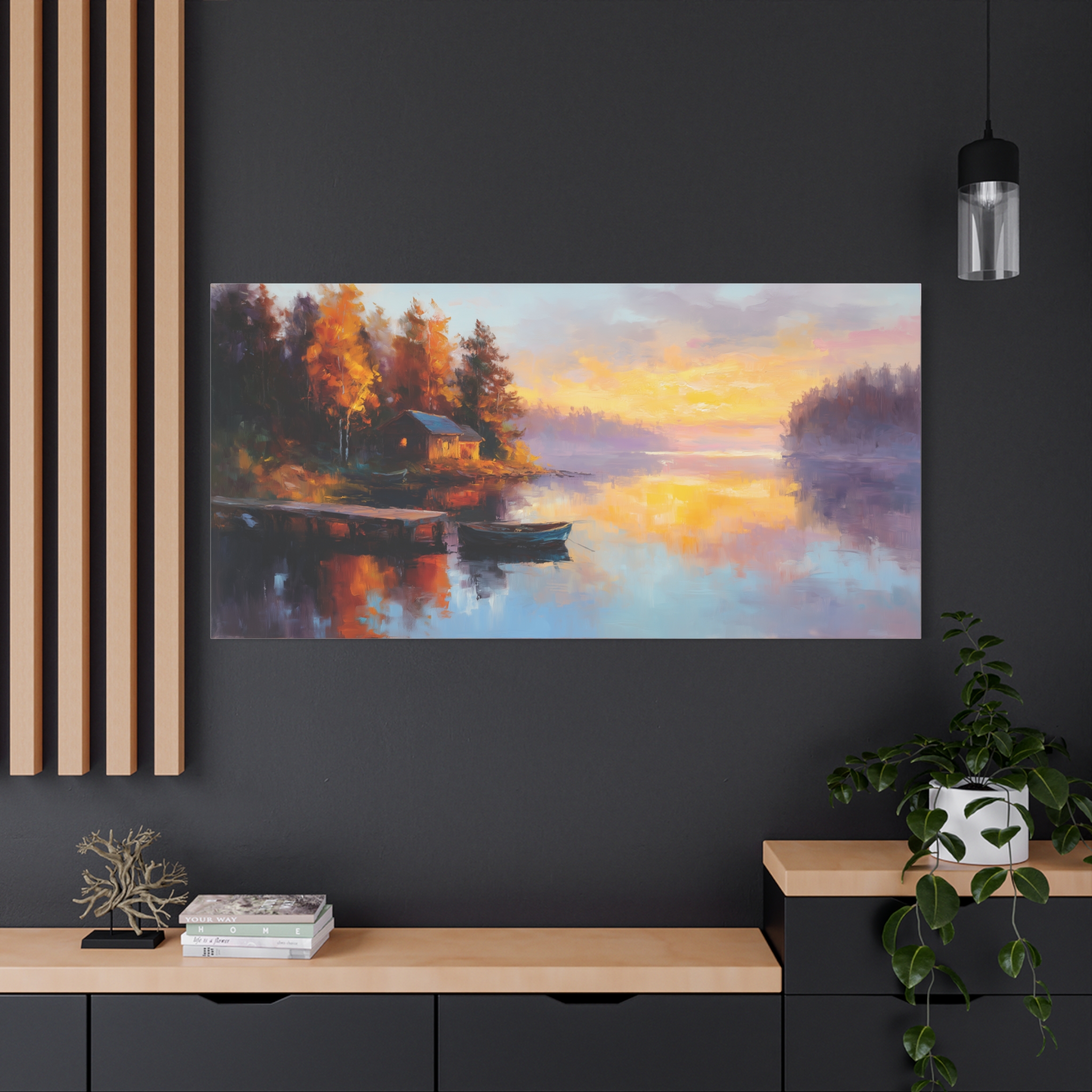 Bring the serene atmosphere of a cabin by the lake into your home with this beautiful canvas print in violet and orange. Perfect for nature lovers and those who appreciate rustic decor, this canvas will add a peaceful vibe to any room. Ideal for decorating a cabin or rustic-themed space, this canvas is also a great gift for outdoor enthusiasts or those who love the tranquility of lakeside living. Perfect for decorating during all seasons, especially in the fall or winter.