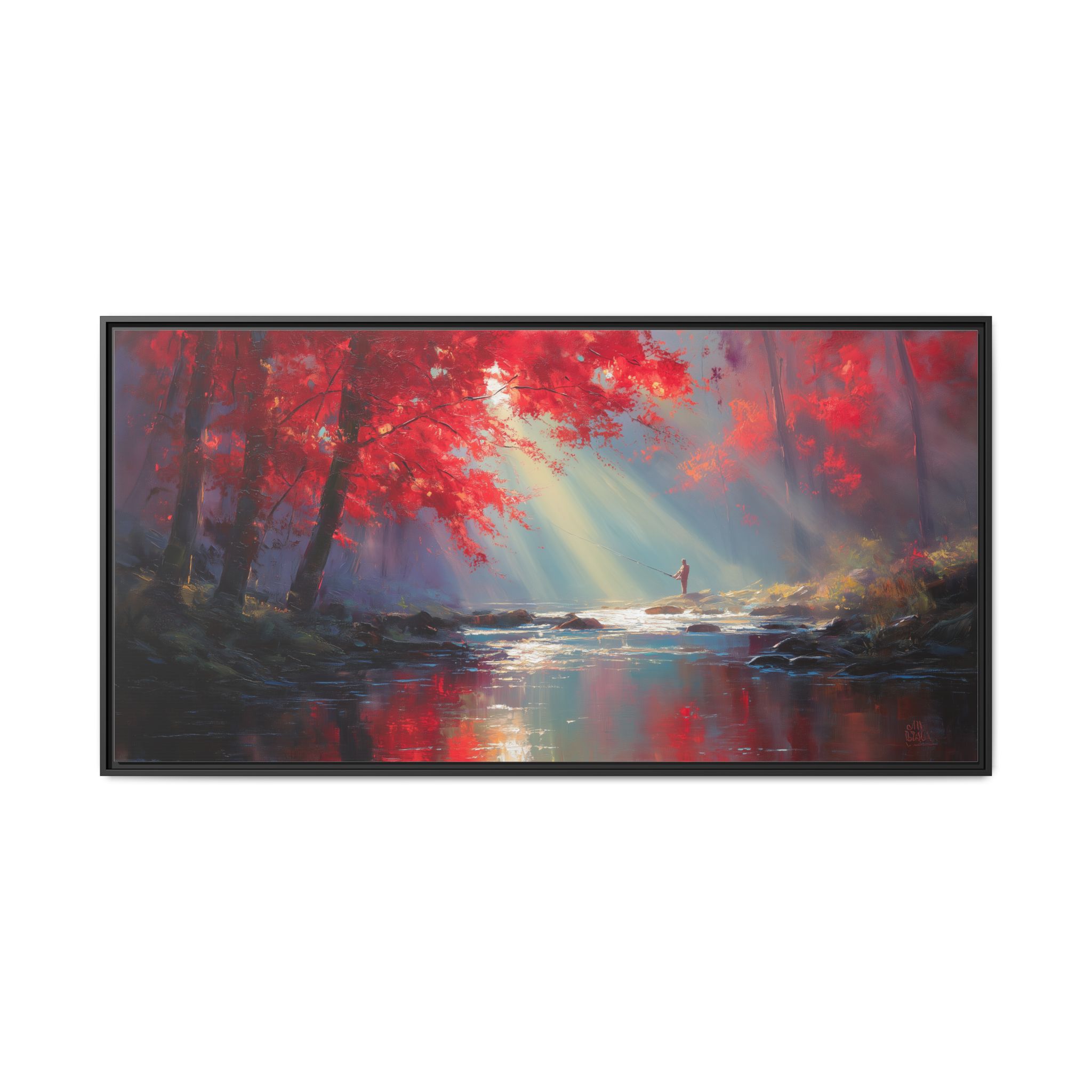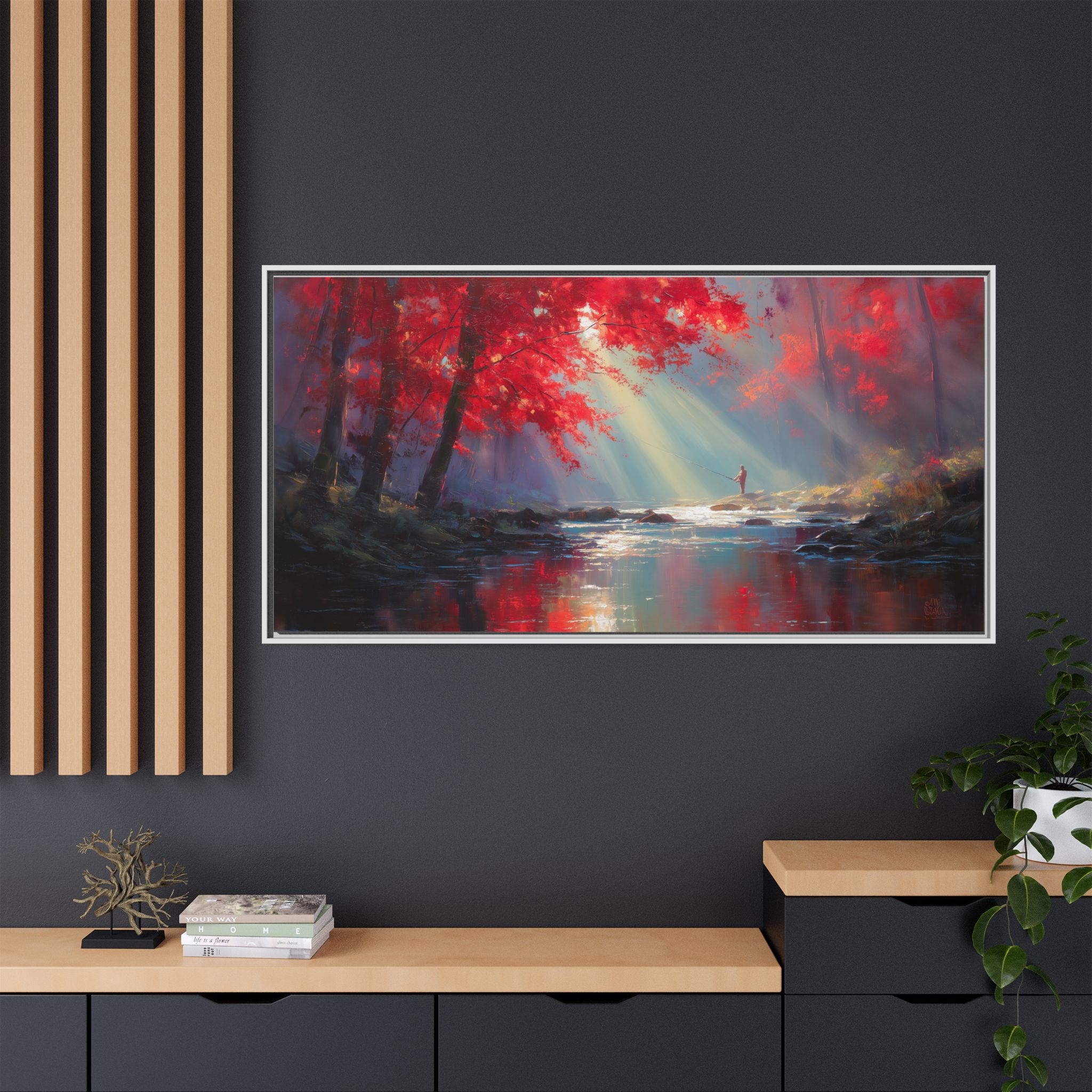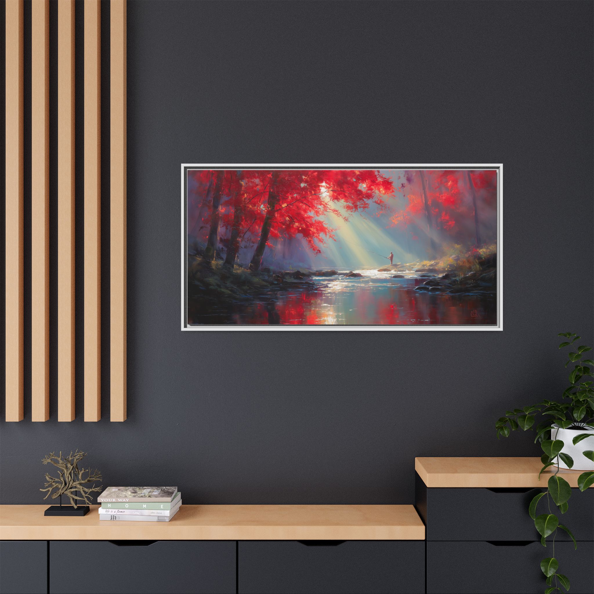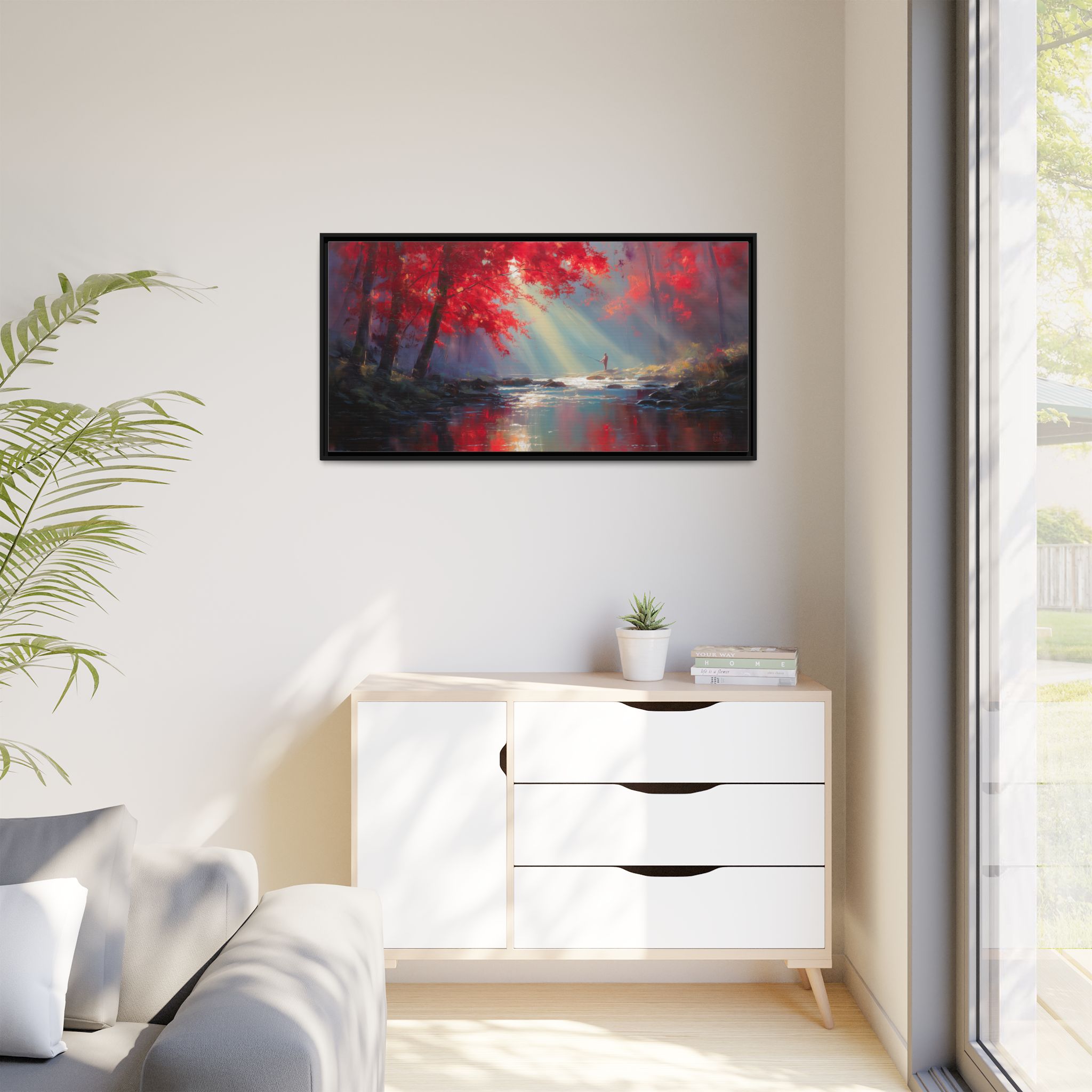 This framed matte canvas print features a serene design of fishing under a maple tree, creating a peaceful and nature-inspired vibe. Perfect for nature lovers looking to add a calming touch to their living spaces. Ideal for cabins, lake houses, and rustic home decor. Relevant for Father's Day, birthdays, and housewarming gifts.