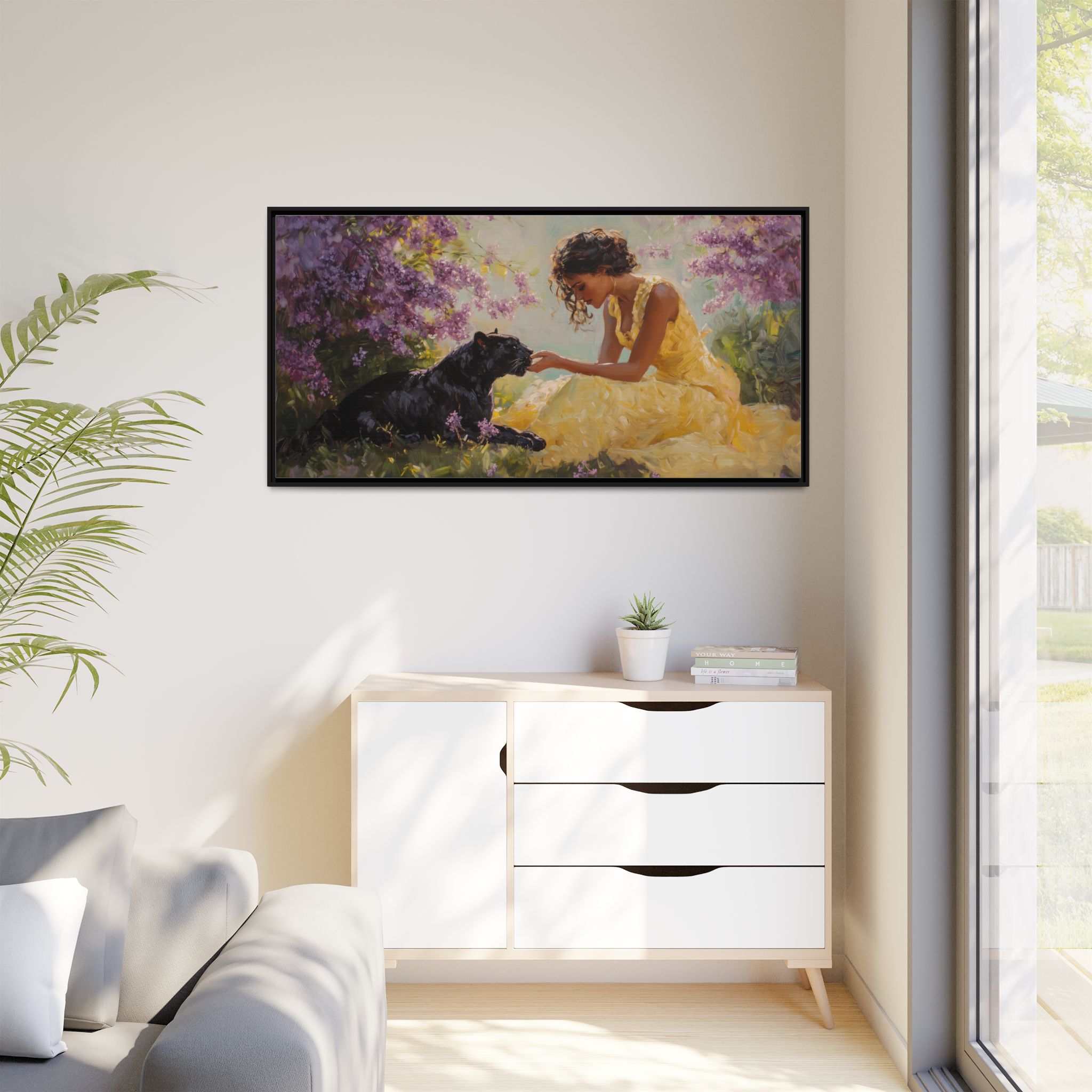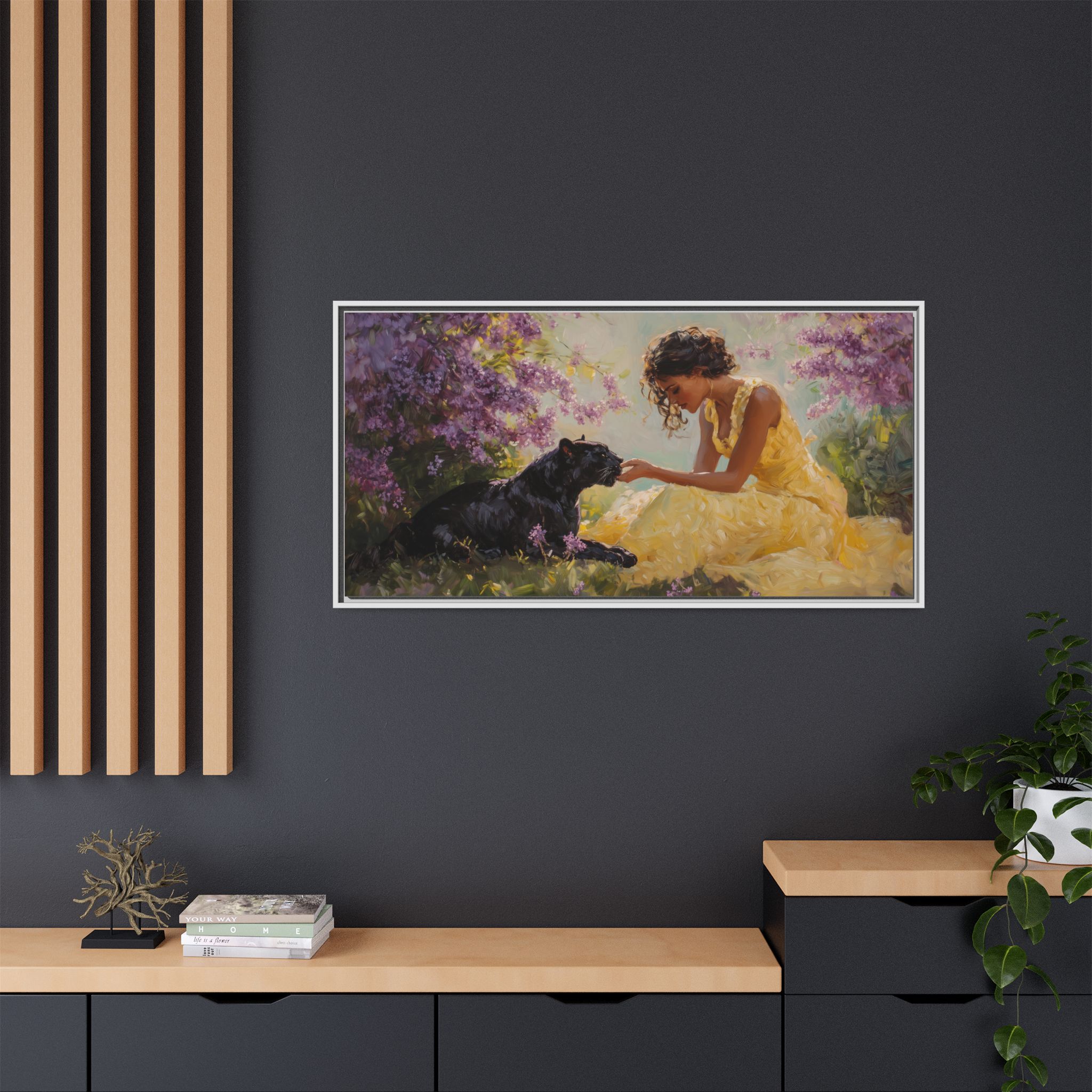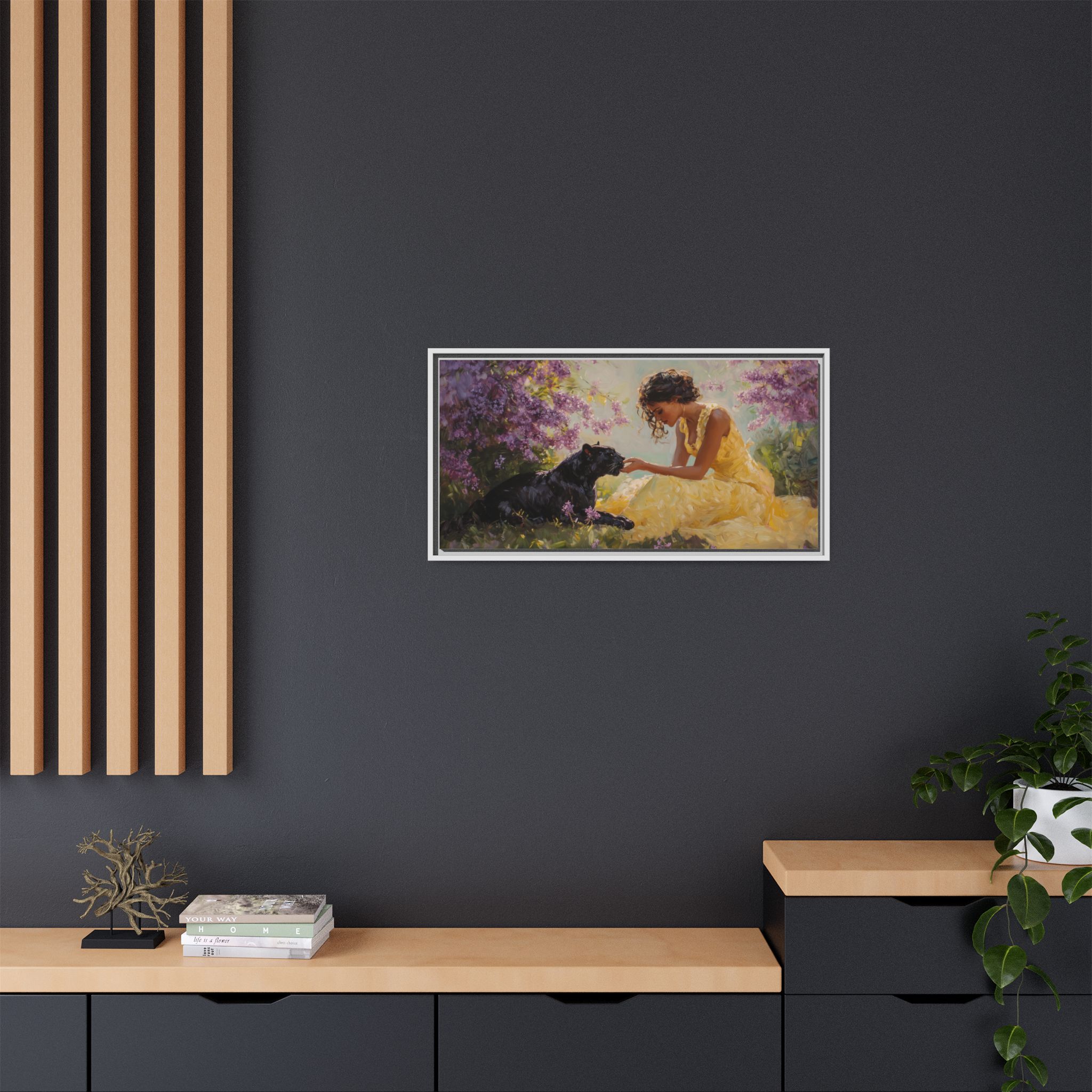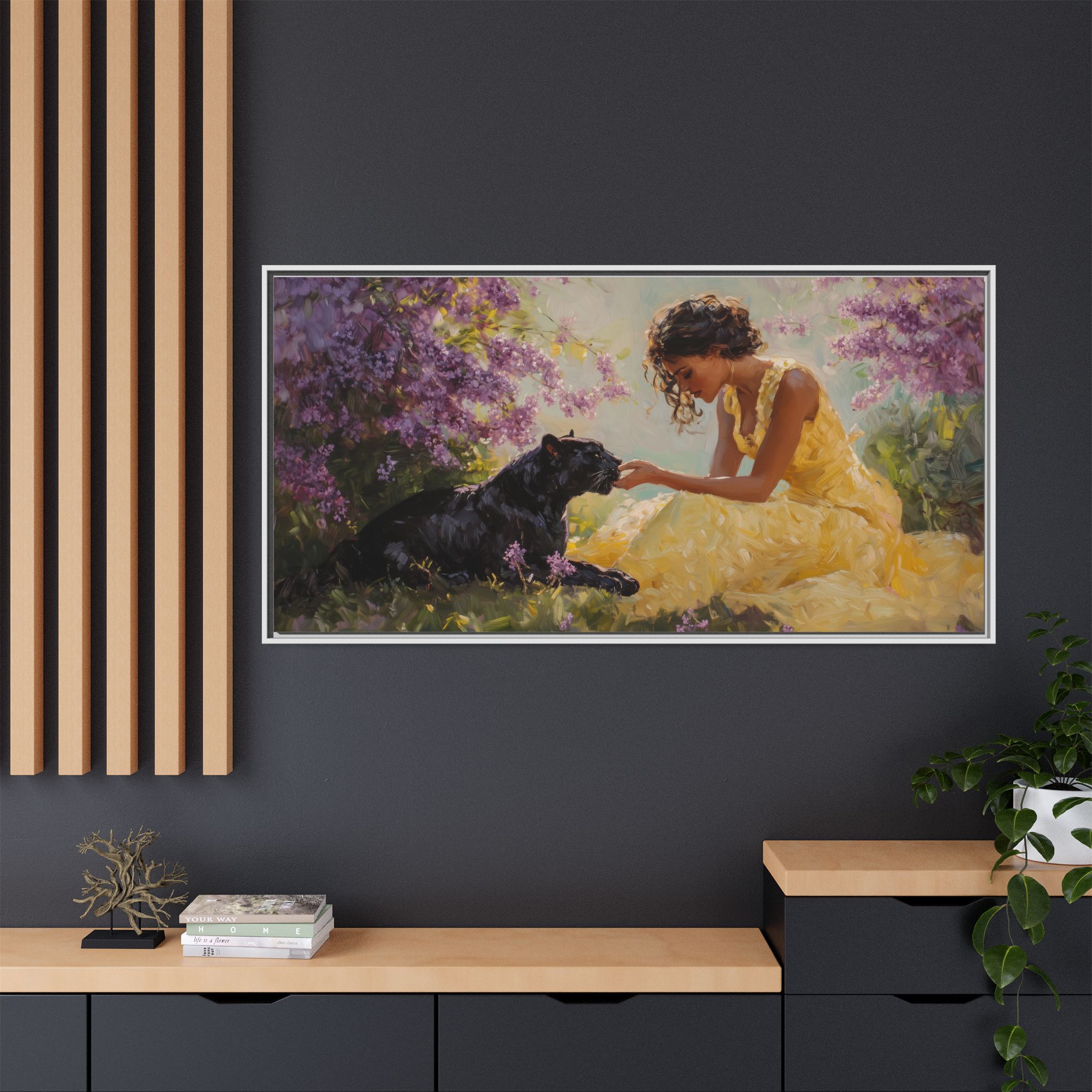 A stunning matte canvas print of a girl playing with a panther, bringing a wild and adventurous vibe to any space. Perfect for animal lovers and those who appreciate unique and captivating art pieces. Ideal for gifting on birthdays, holidays, or as a housewarming present.