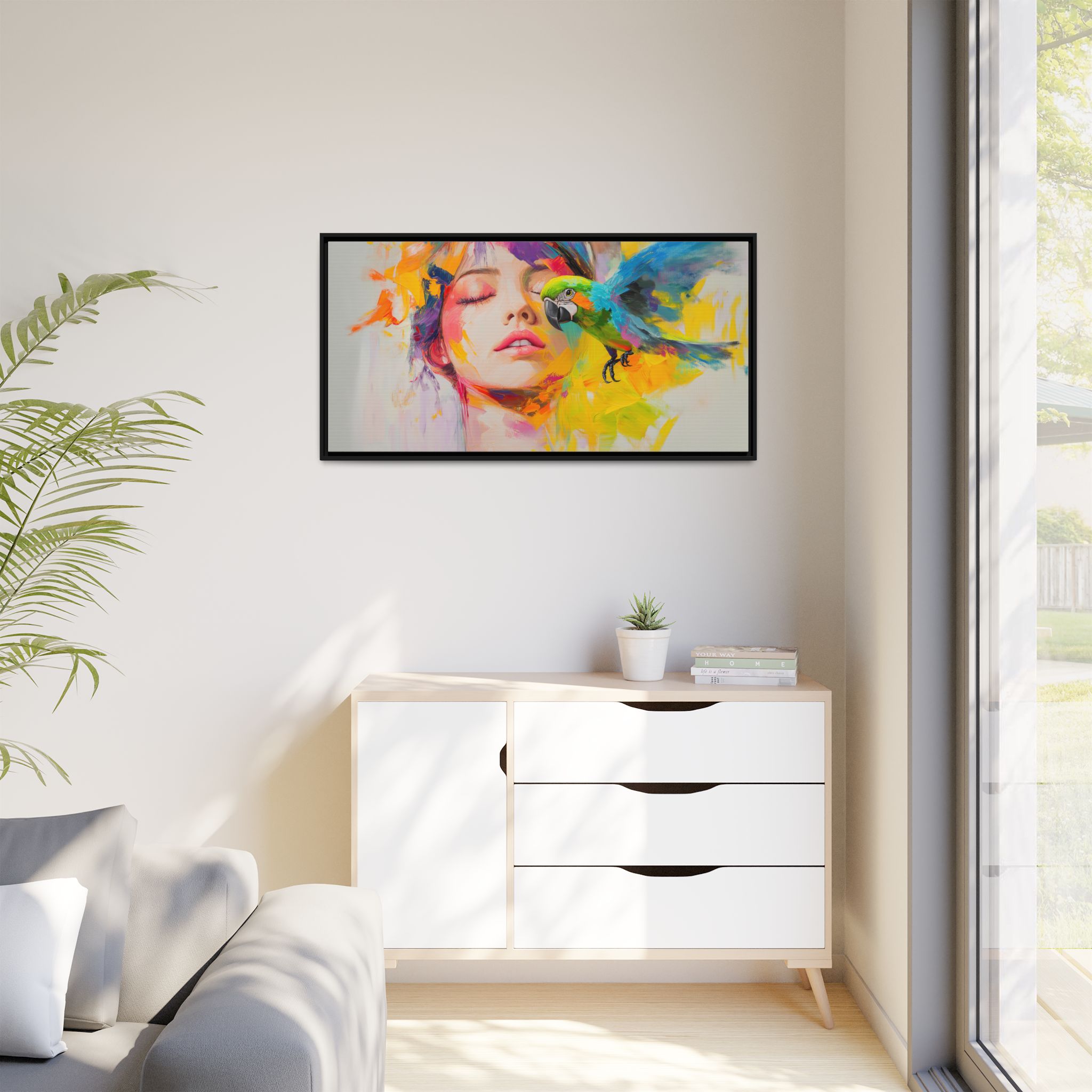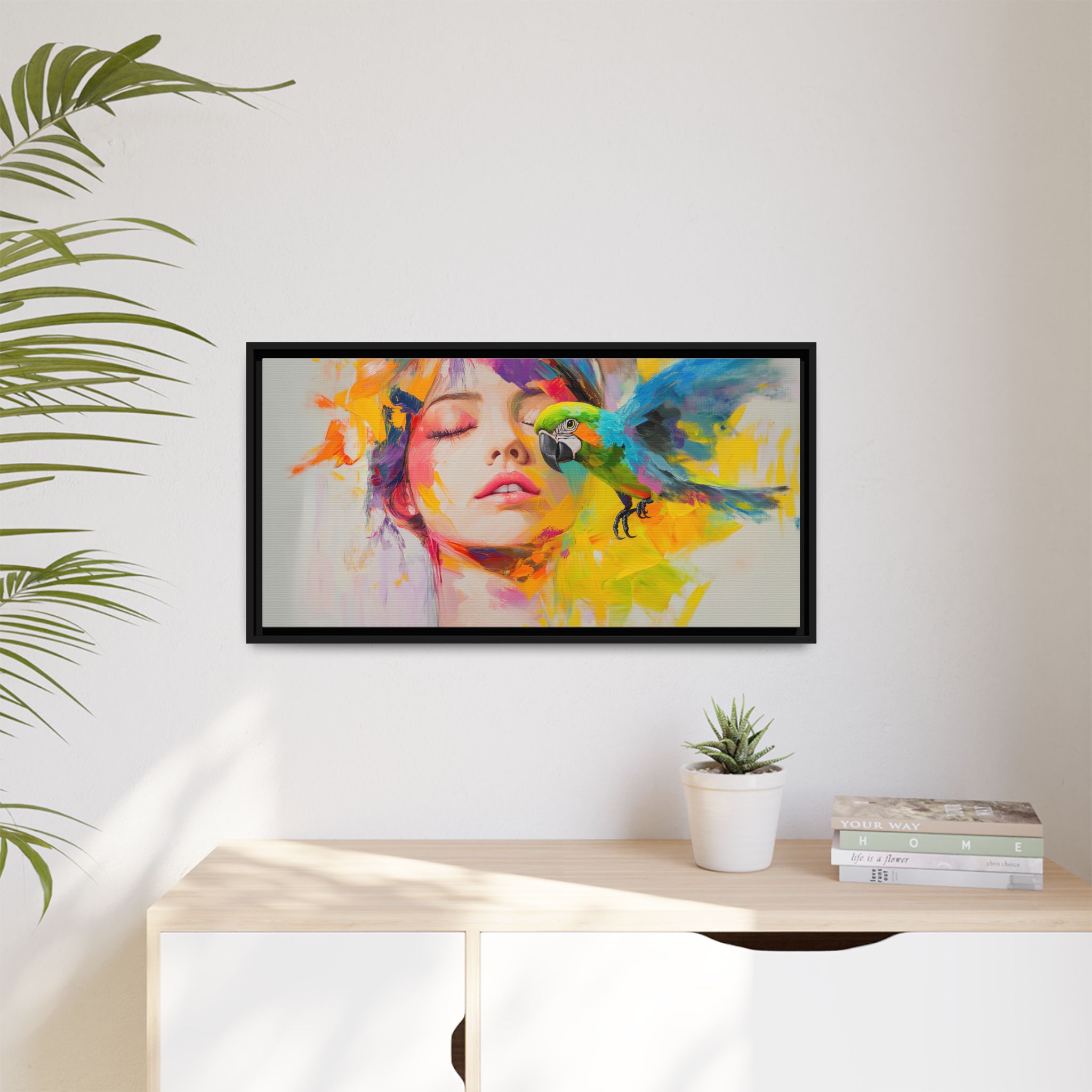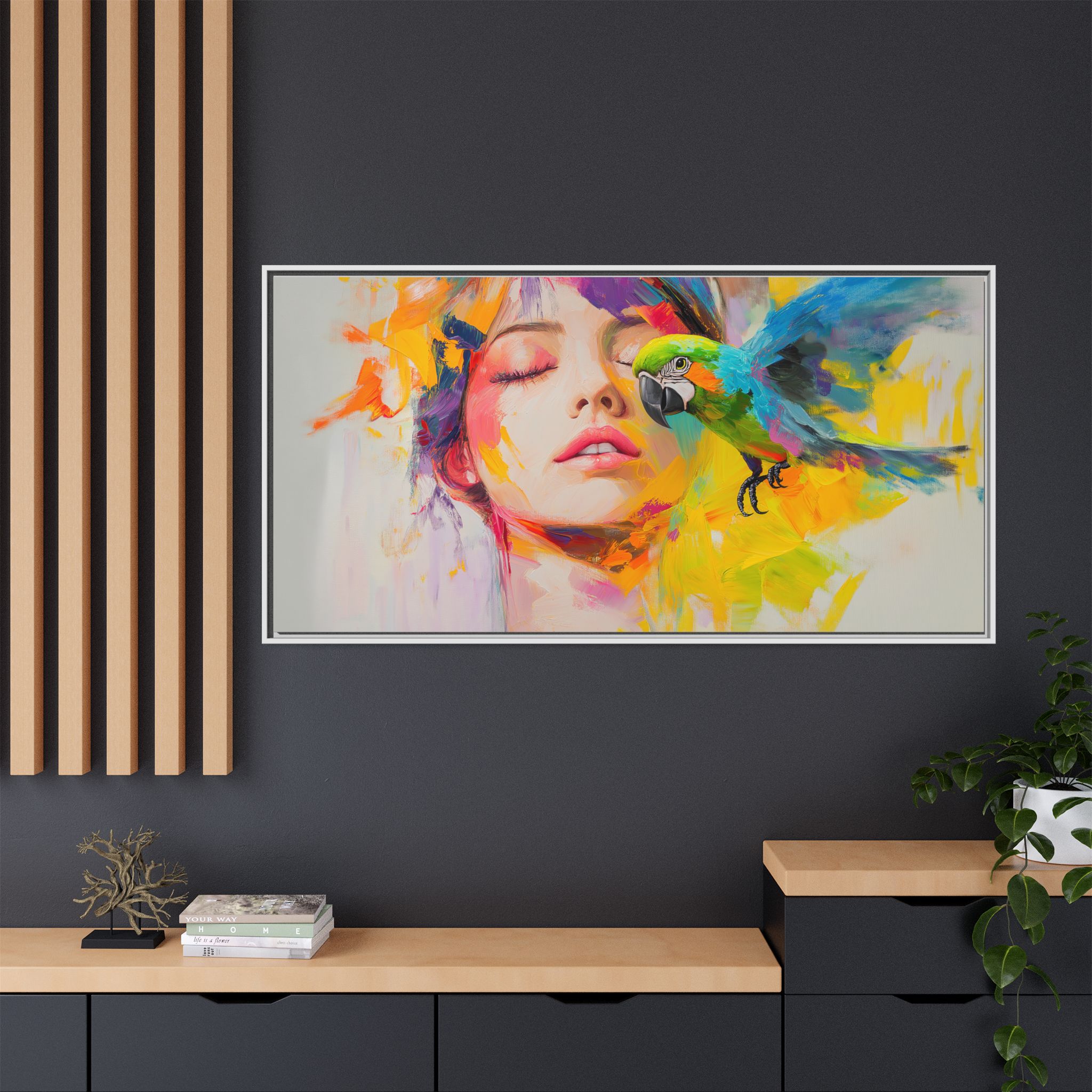 A matte canvas print featuring a girl with a flying parrot, adding a touch of whimsical and artistic vibe to your space. Perfect for art enthusiasts and those who appreciate unique and creative decor. Ideal for gifting on birthdays, holidays, and special occasions.