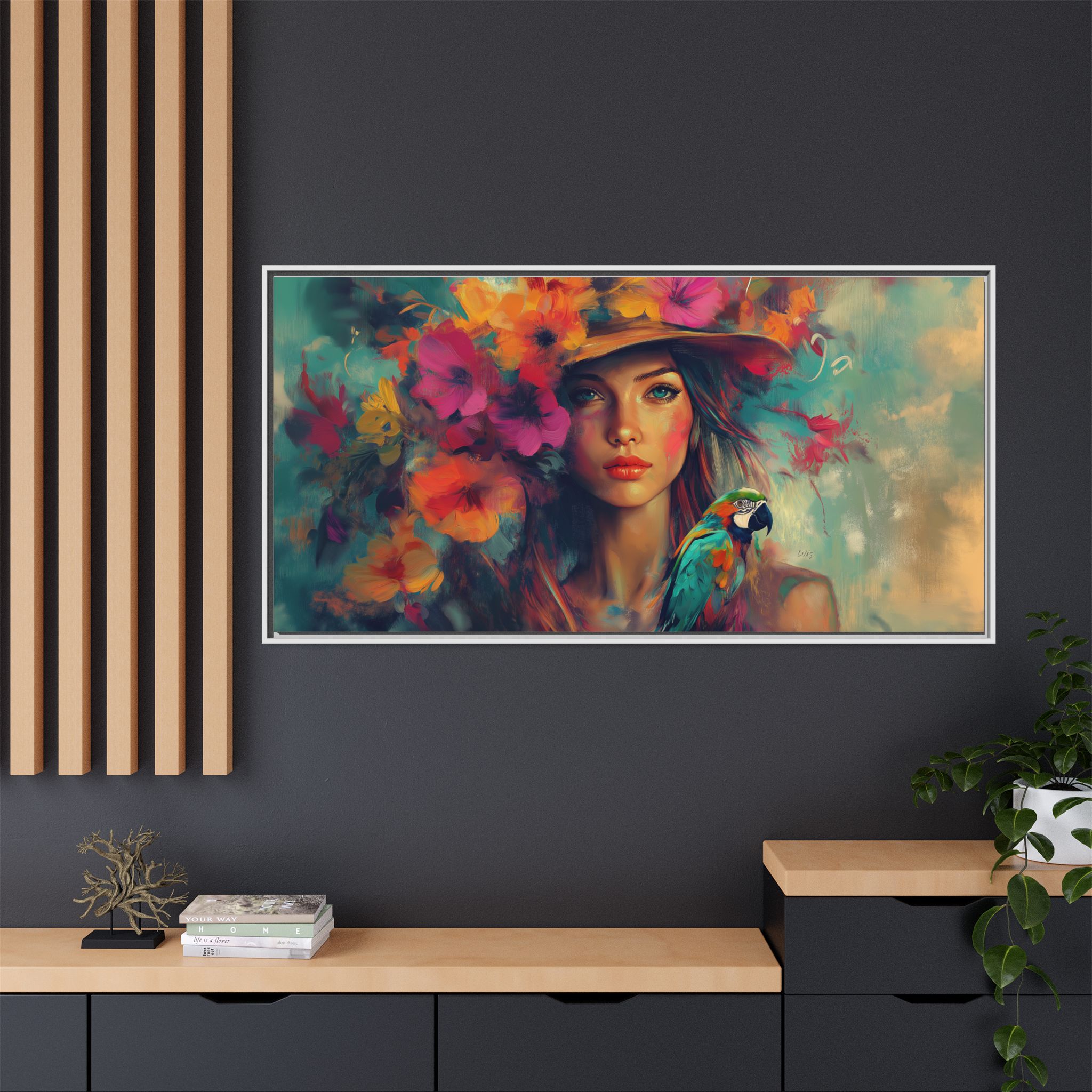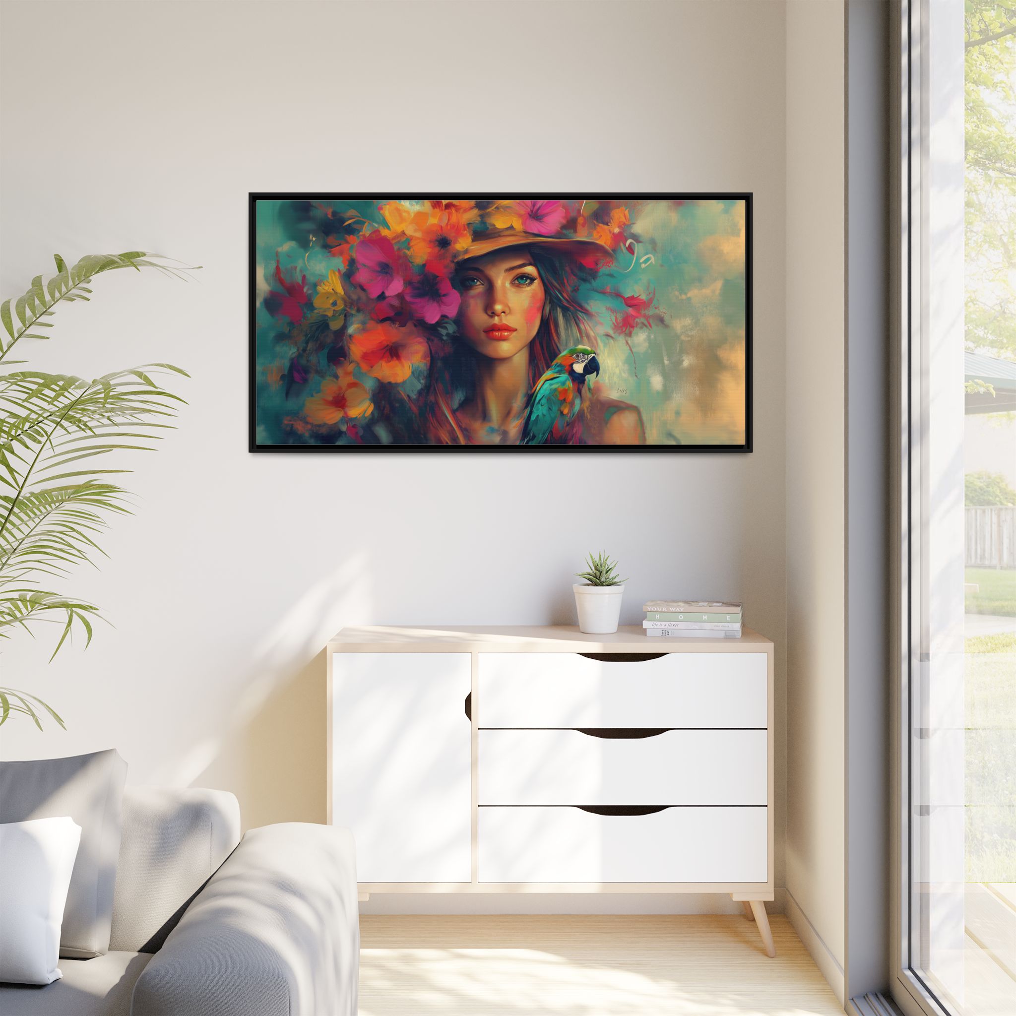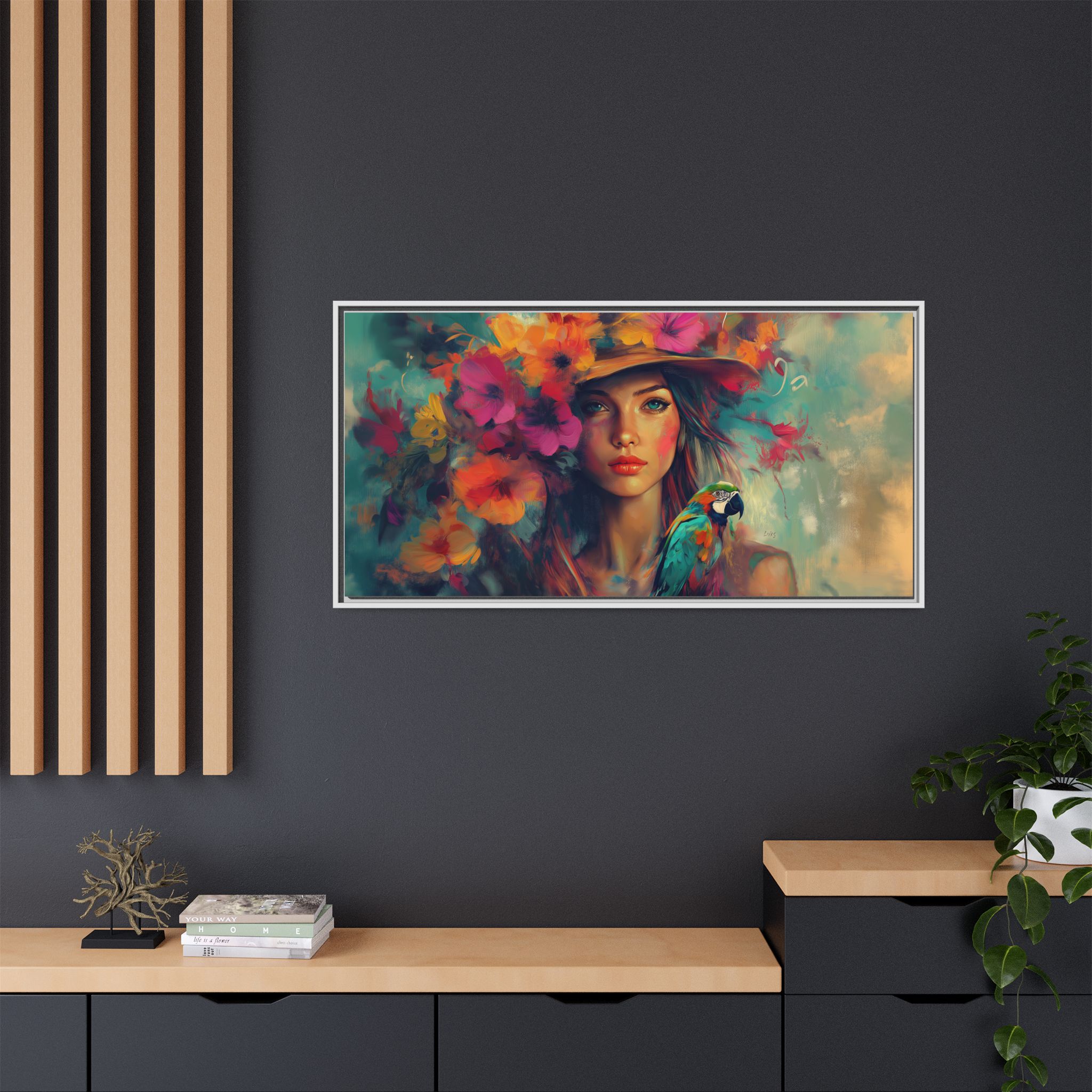 A beautiful canvas print featuring a girl with a hat of flowers, adding a touch of nature and beauty to any room. Perfect for art lovers and those seeking a whimsical and artistic vibe in their home decor. Ideal for gifts for birthdays, holidays, or special occasions.