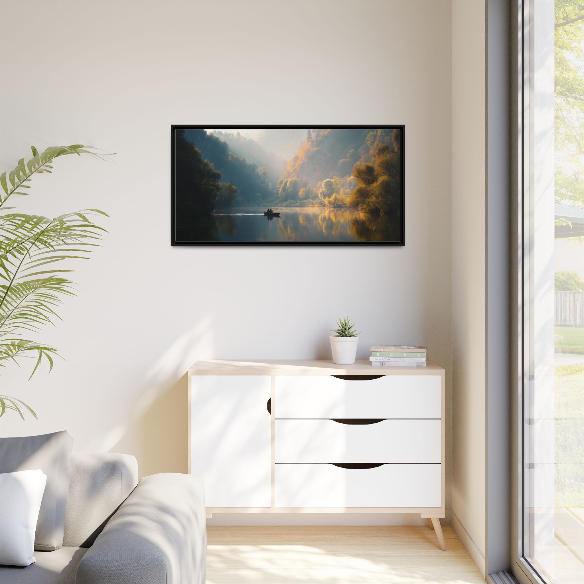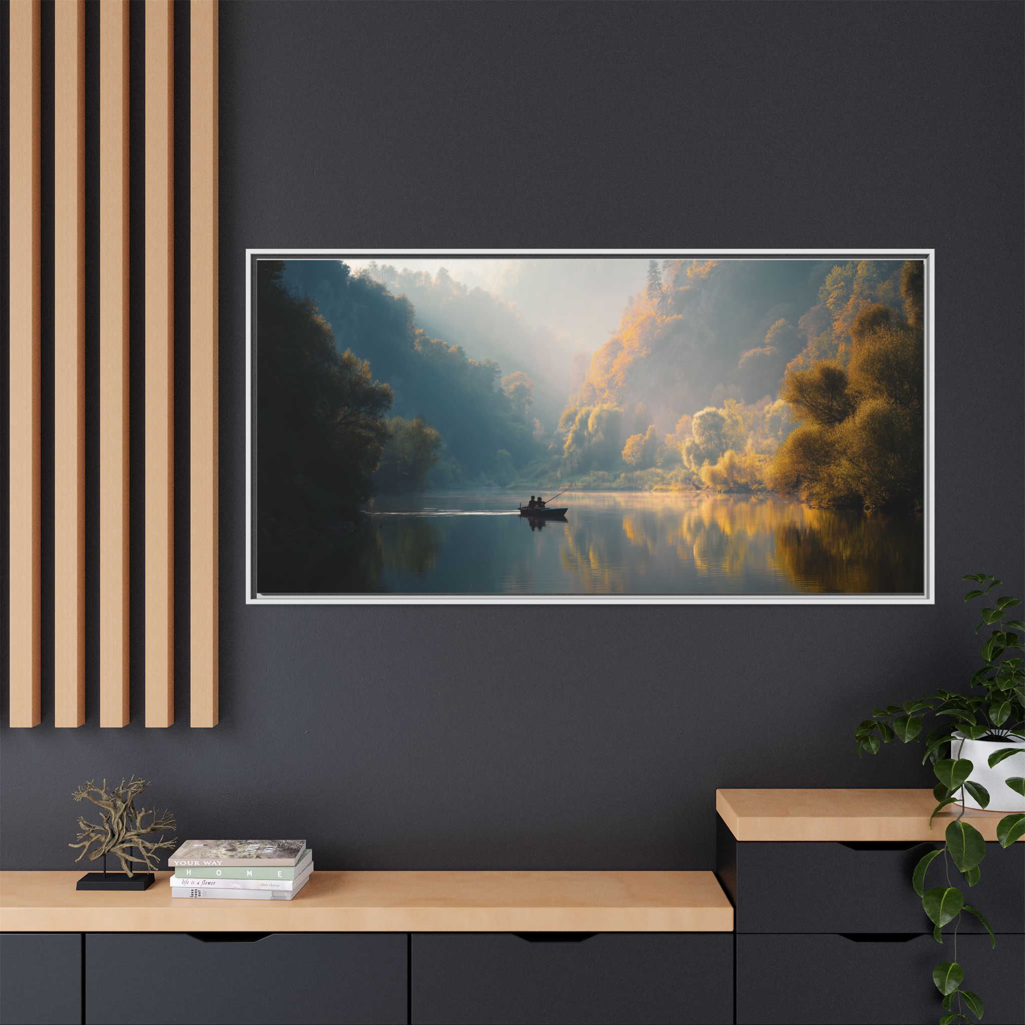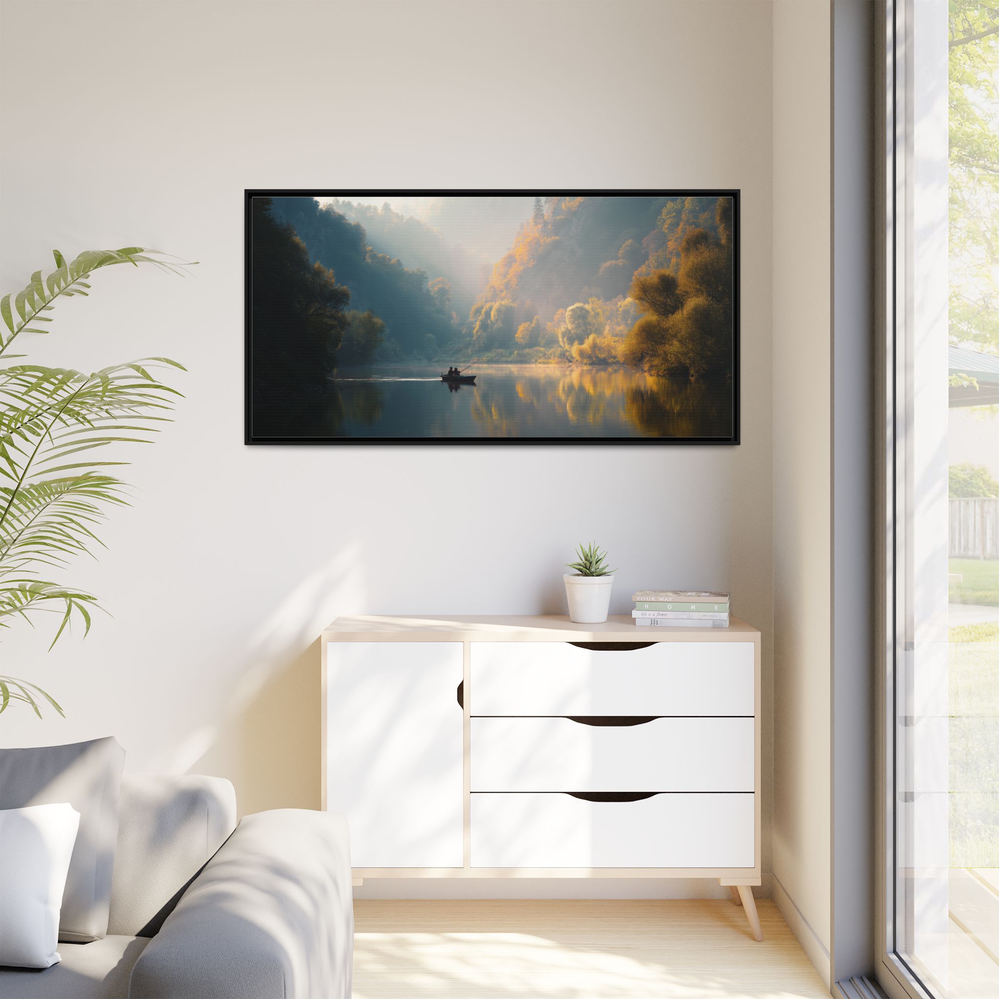 A matte canvas framed canvas print featuring a design of someone going fishing. This canvas print exudes a calm and serene vibe, perfect for a fishing enthusiast's home or office decor. Ideal for Father's Day, birthdays, or as a gift for anyone who loves fishing.