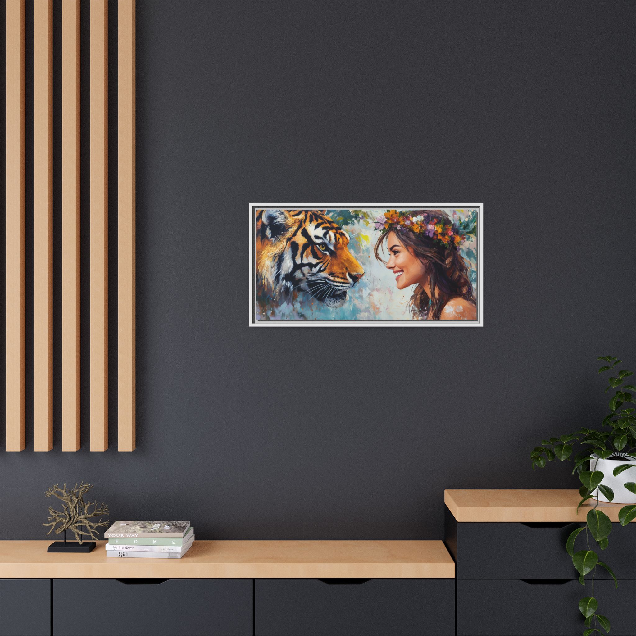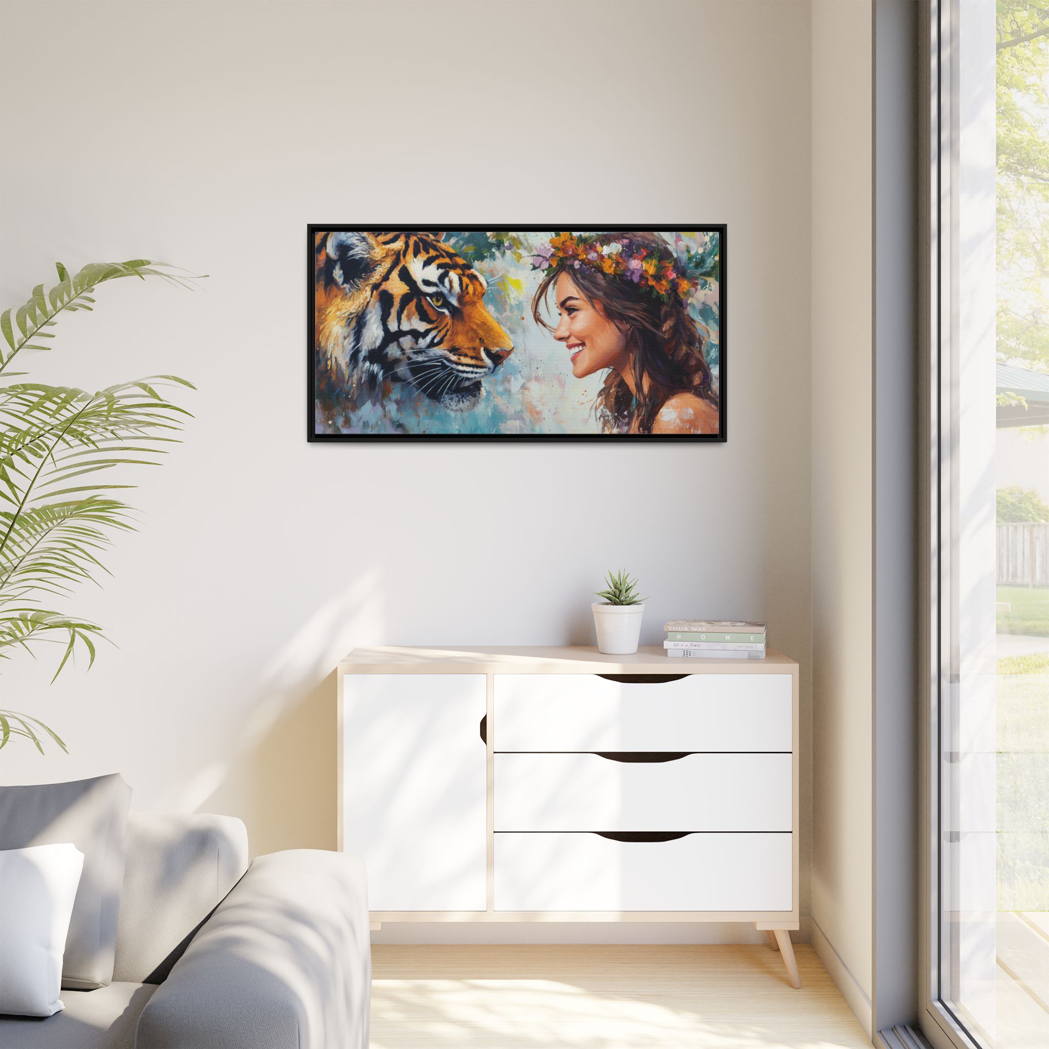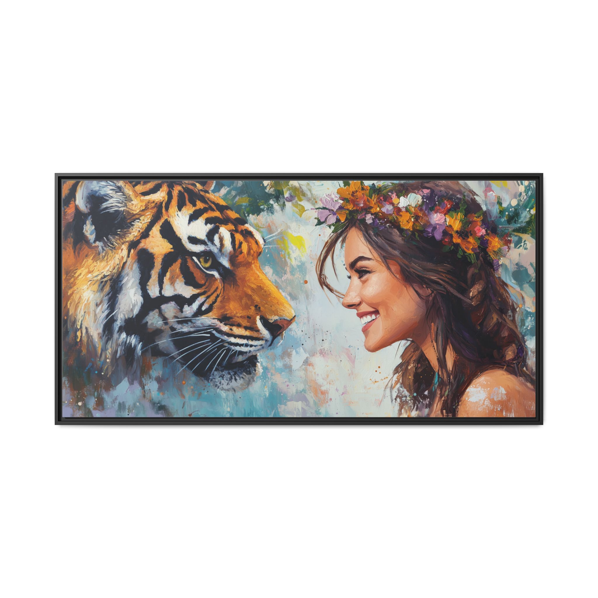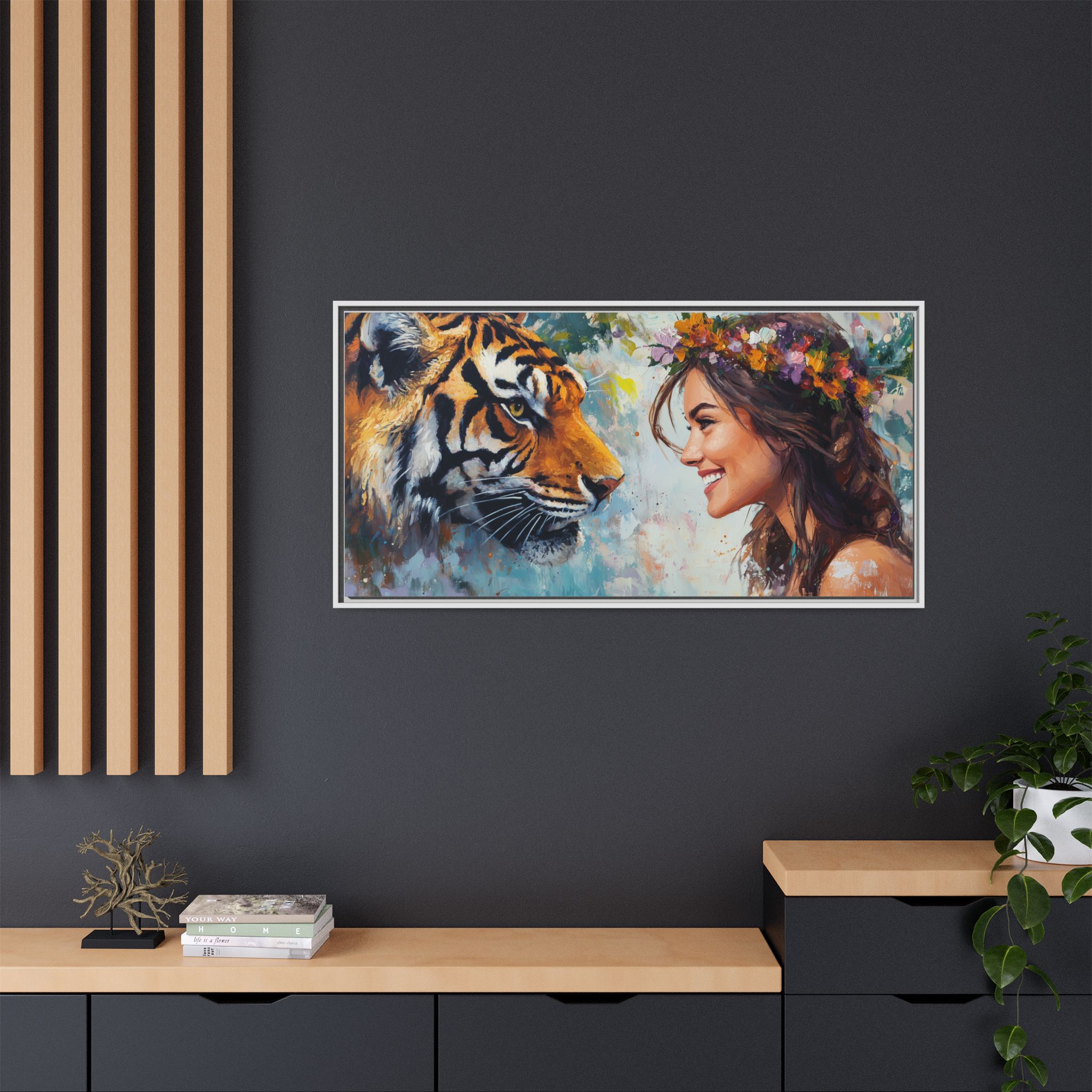 A beautiful canvas print featuring a happy girl with her pet tiger, perfect for adding a touch of joy to any room. This unique and vibrant piece is ideal for animal lovers and those who appreciate eye-catching art. Great for home decor, gift-giving, birthdays, and special occasions.