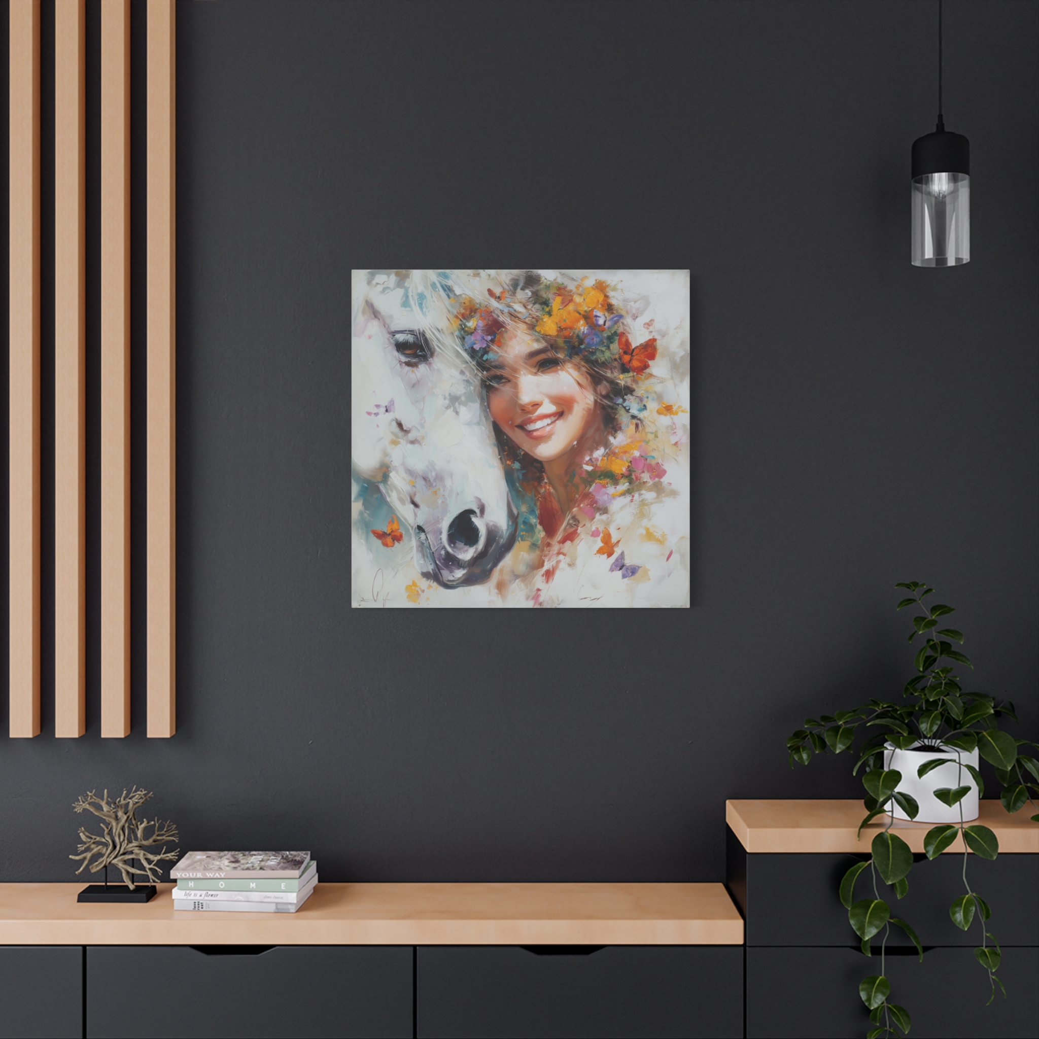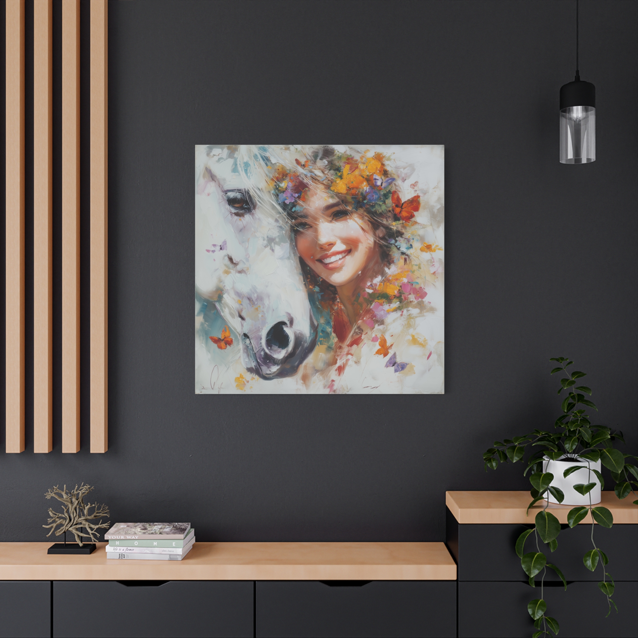 Add a touch of whimsy and joy to your home decor with this canvas print featuring a happy girl with a white horse. Perfect for horse lovers and those who appreciate a cheerful atmosphere in their space. Ideal for gifting during birthdays, holidays, or as a housewarming present.