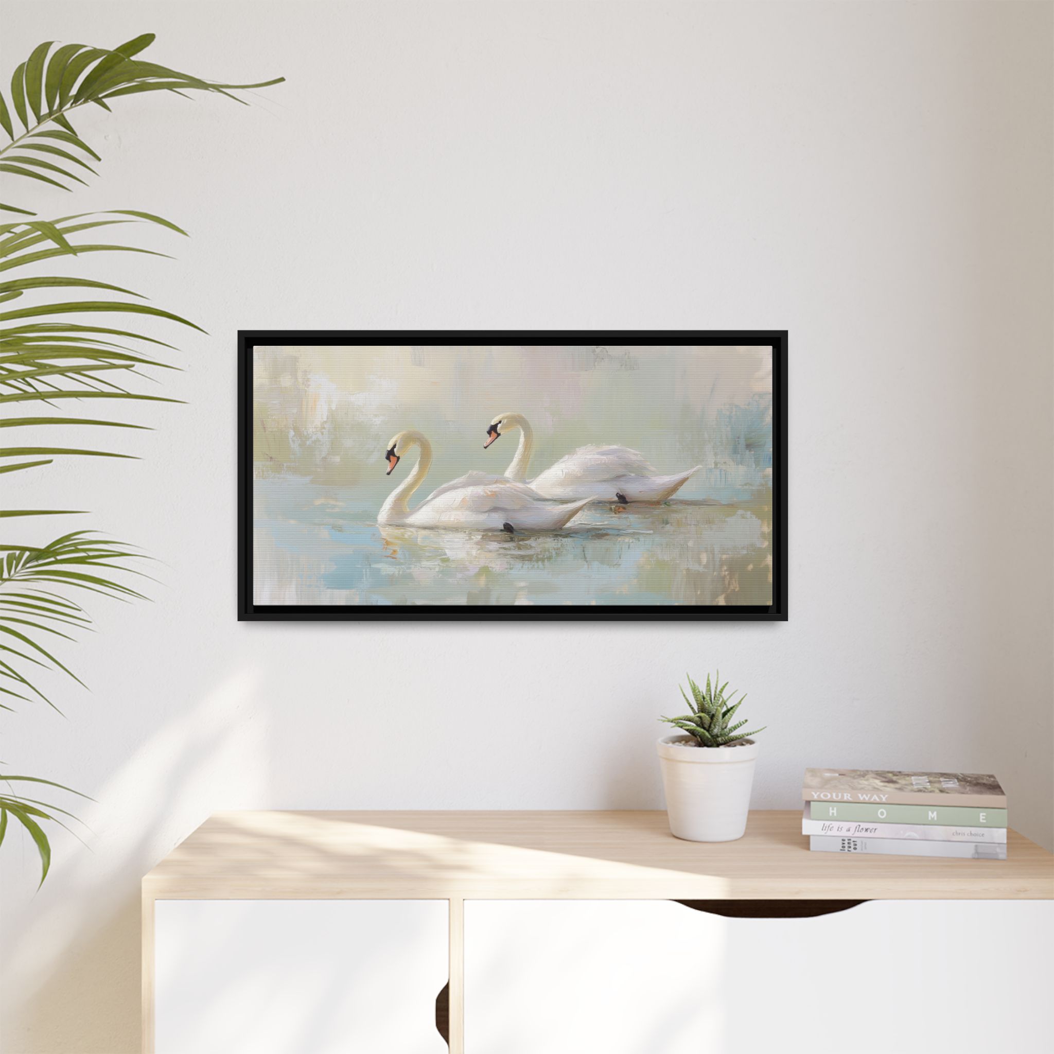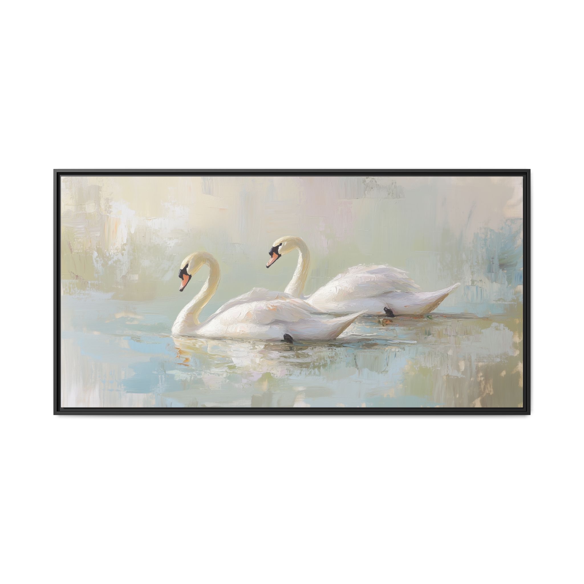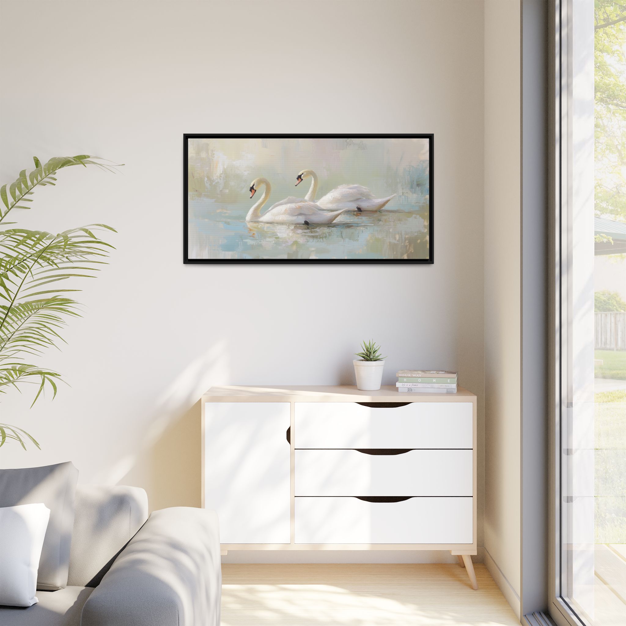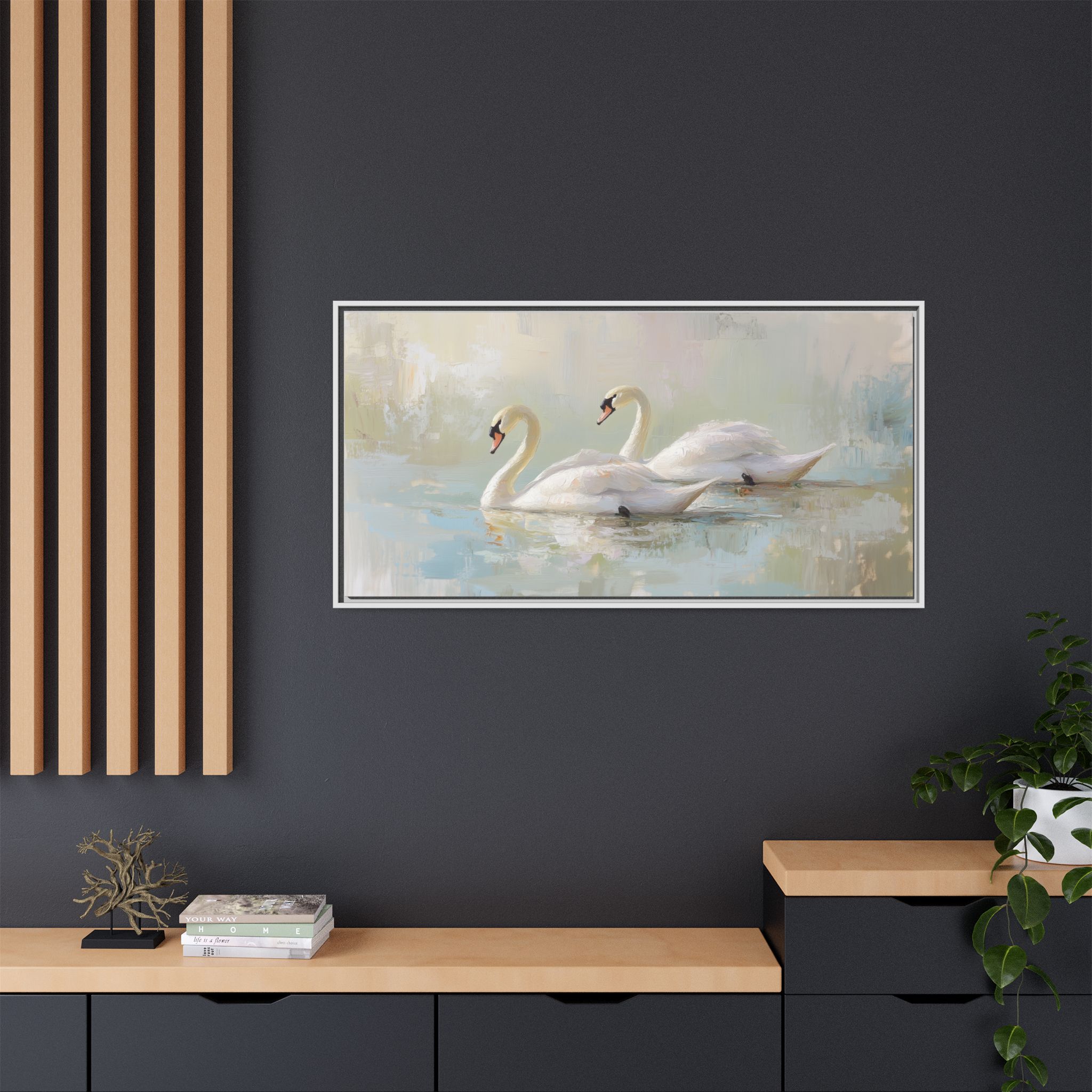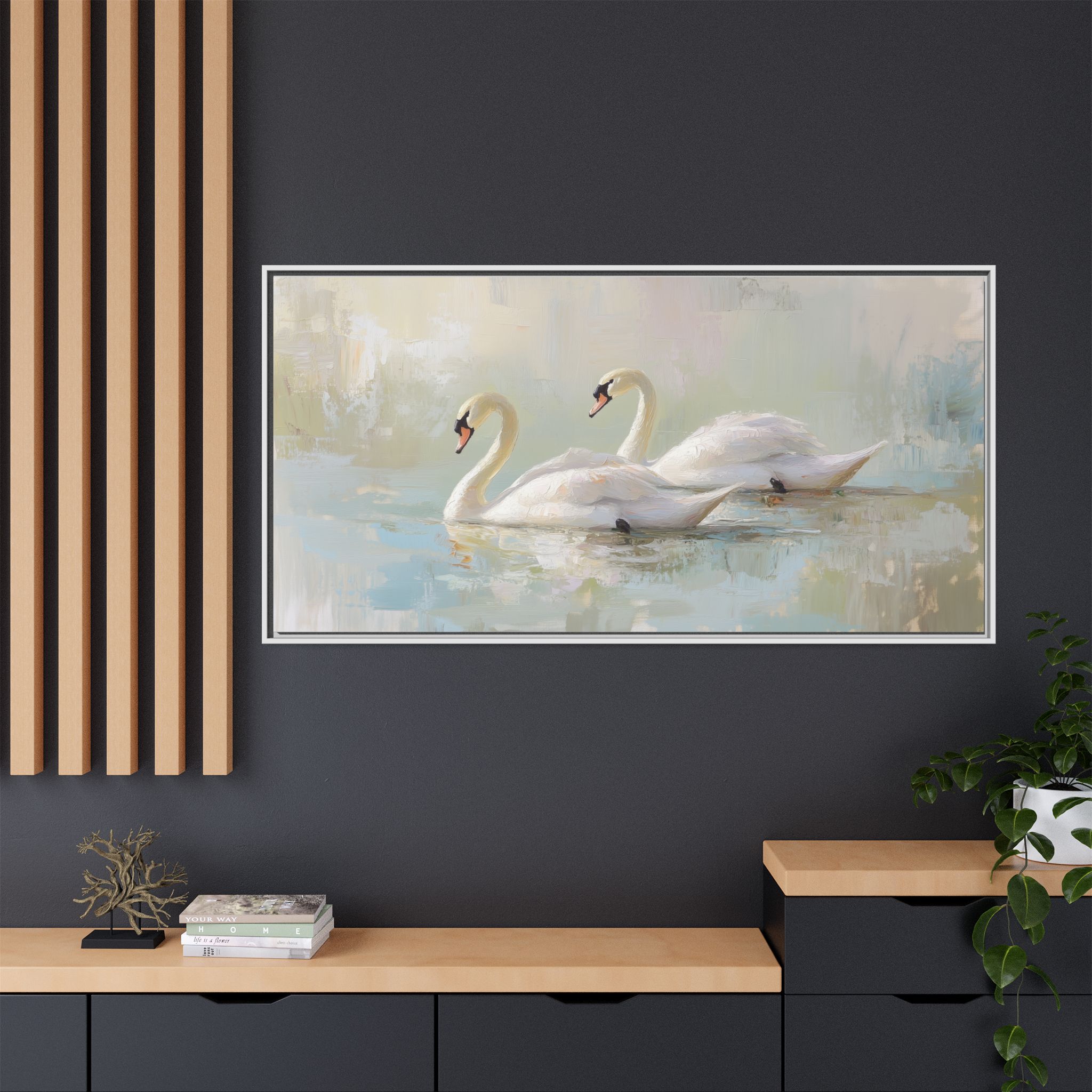 Canvas featuring lovely white swans, giving a serene and elegant vibe to any space. Perfect for nature lovers and those who appreciate peaceful artwork. Ideal for decorating homes, offices, or gifting on special occasions like birthdays or housewarmings.