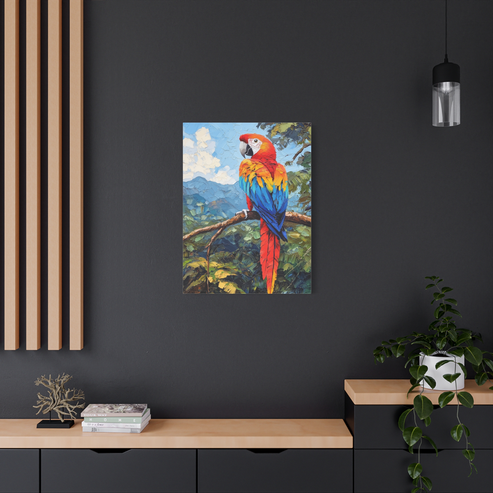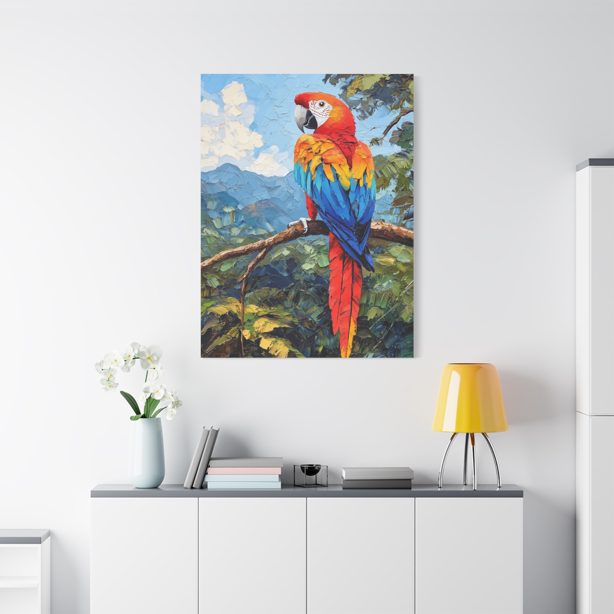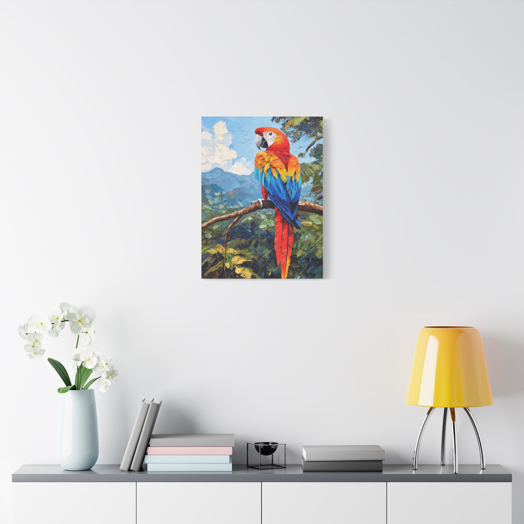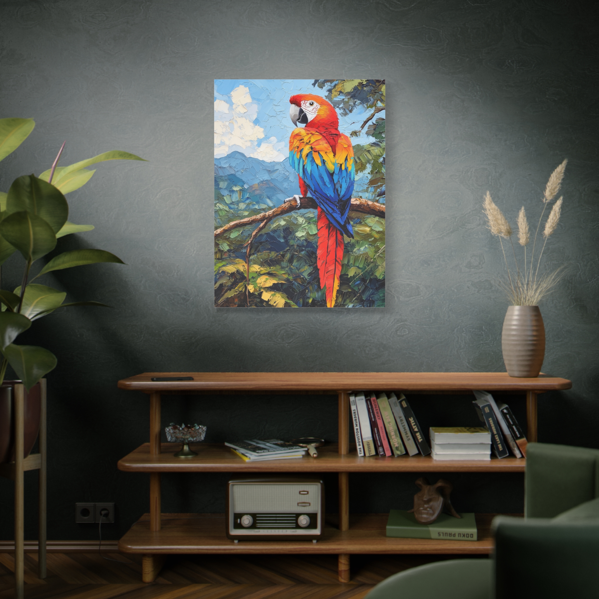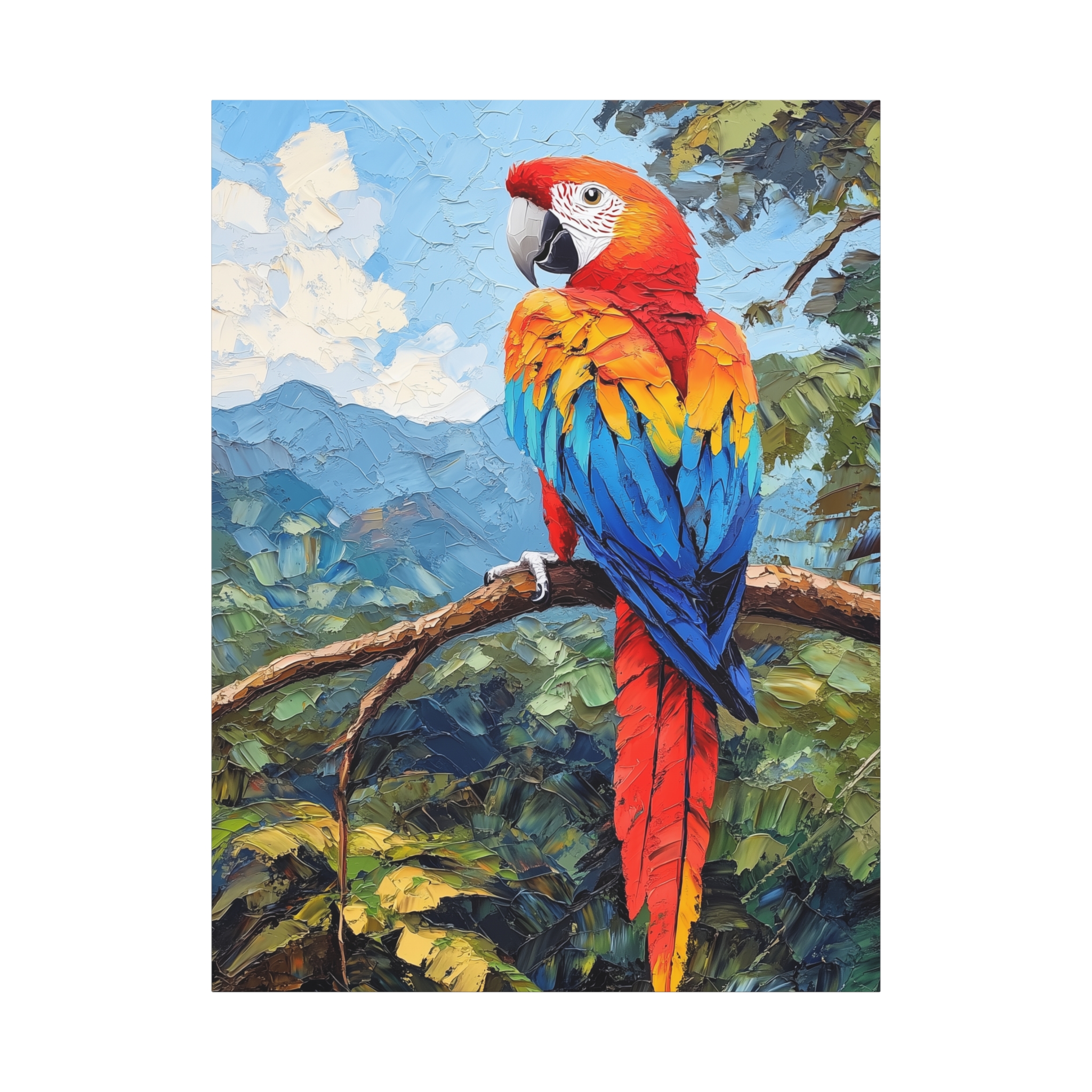 The oil painting "Macaw" captures the vivid beauty of a tropical macaw, showcasing its brilliantly colored plumage in rich blues, reds, and yellows. The bird is likely depicted with striking realism or expressive brushwork, perched dynamically against a lush or abstract background. The artwork radiates energy and exotic allure, emphasizing the macaw's majestic presence and the vibrant textures of its feathers.