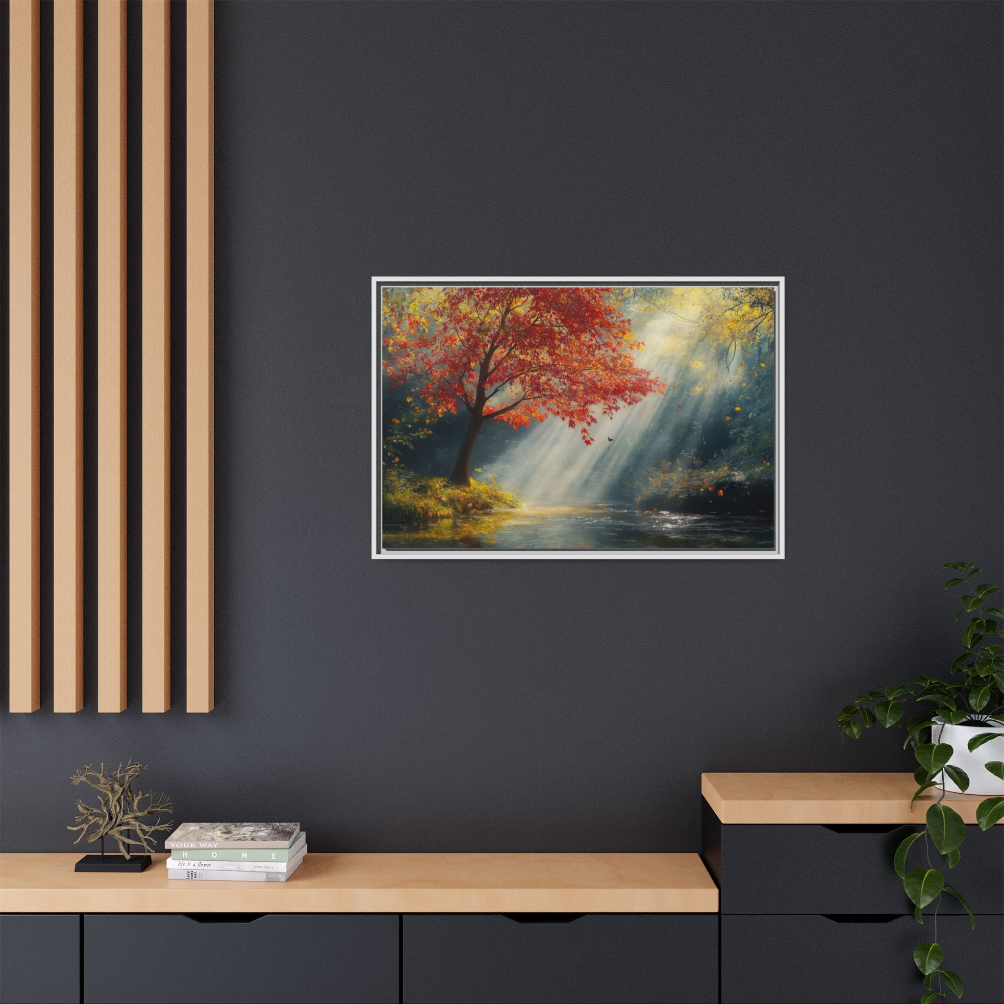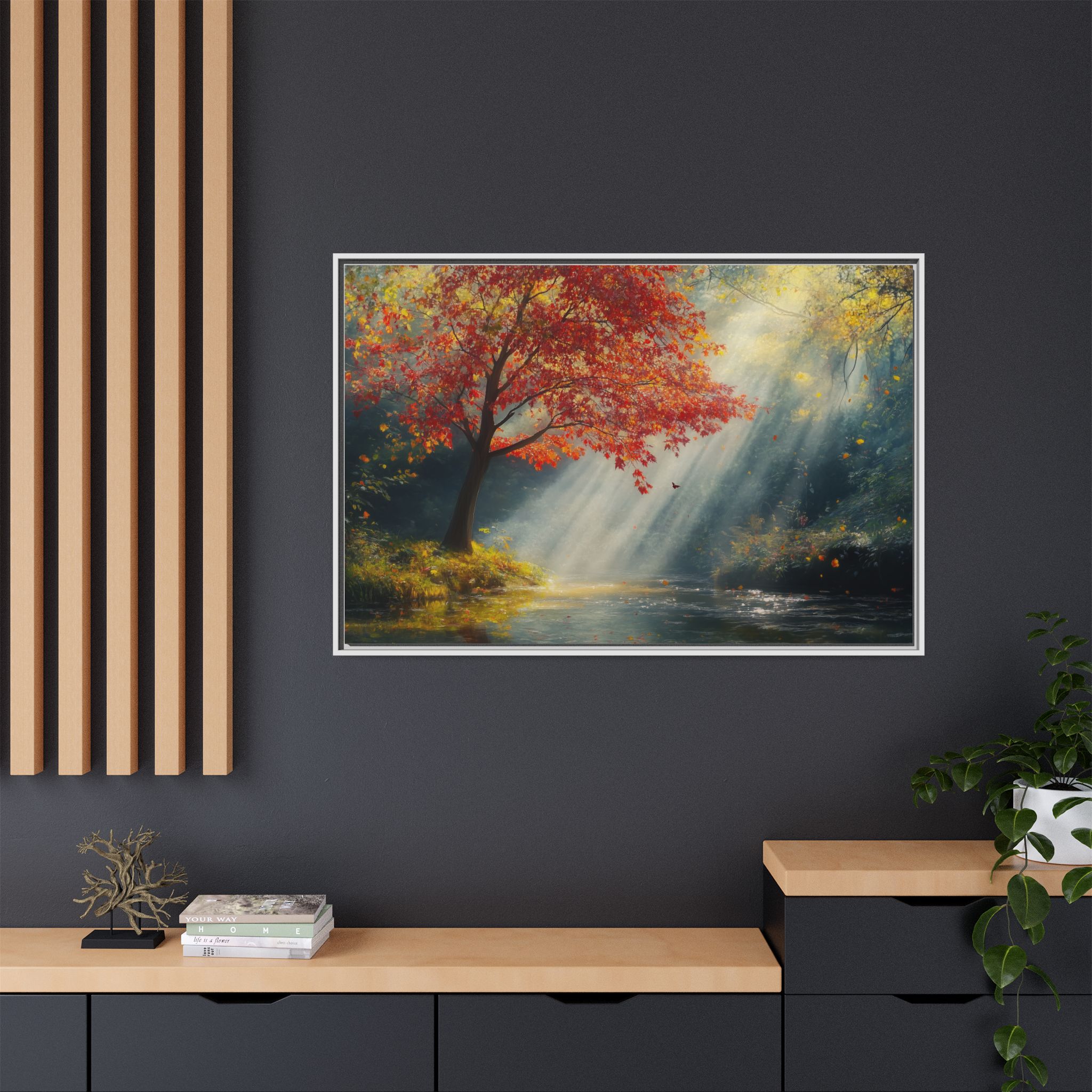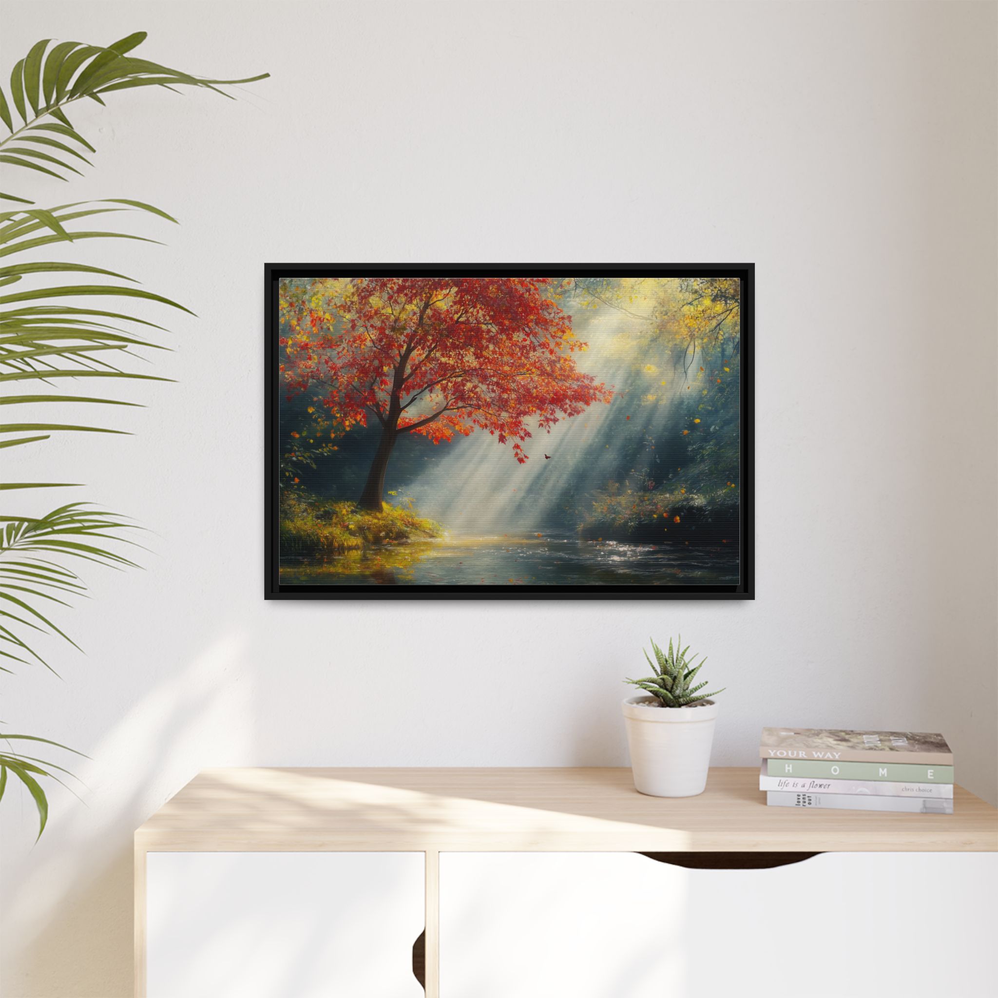 Bring the serene beauty of a maple tree overlooking a river into your space with this framed canvas print. Perfect for nature lovers and those seeking a calming atmosphere in their home or office. Ideal for decorating during the fall season or all year round.