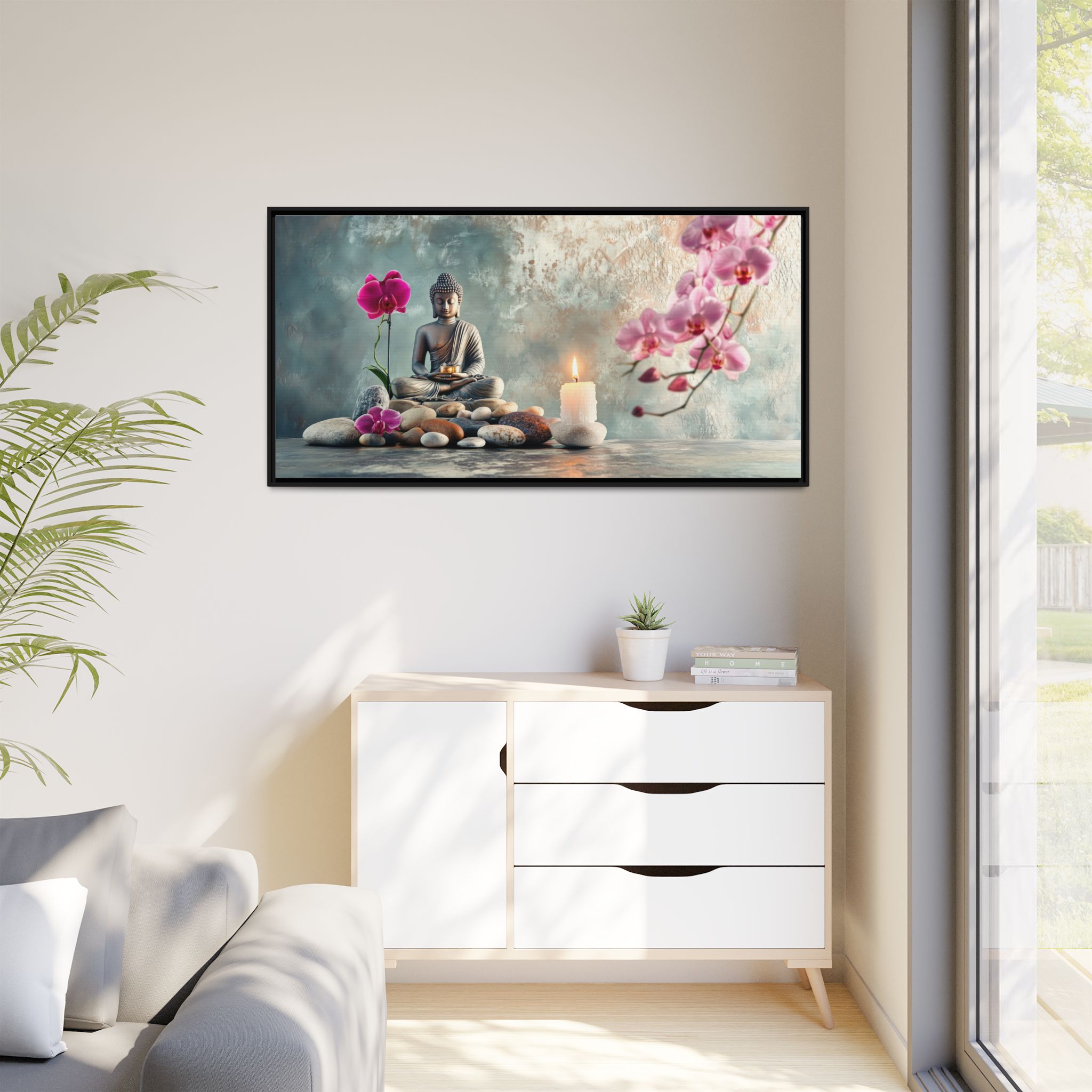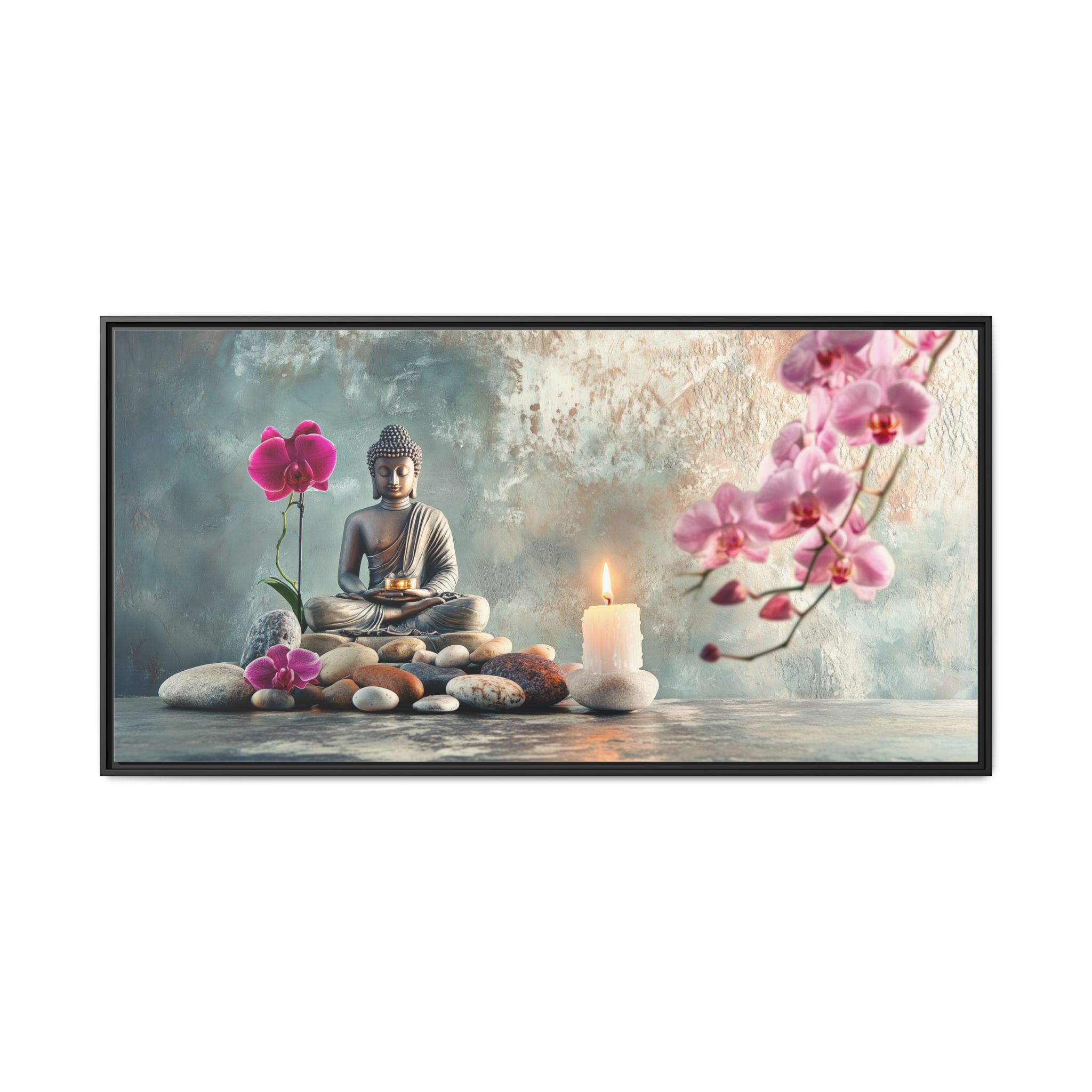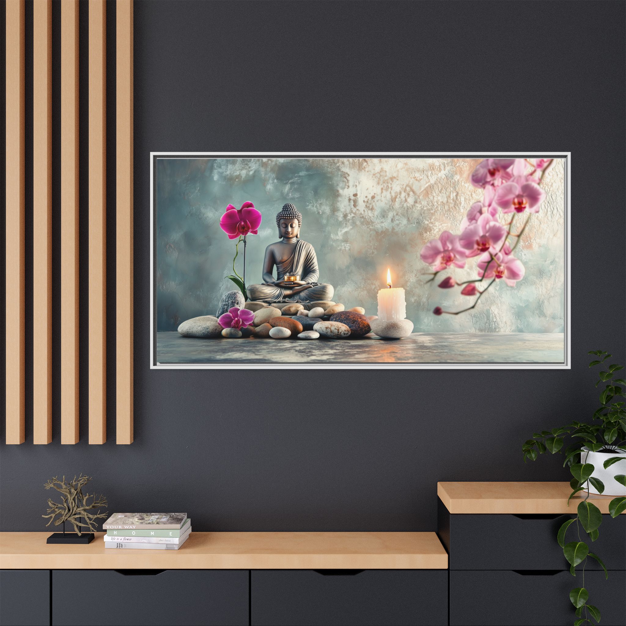 A serene canvas print featuring a purple orchid and Buddha in meditation, perfect for creating a peaceful atmosphere in any space. Ideal for those seeking inner peace and relaxation, this canvas print is relevant for mindfulness practices, meditation spaces, and spiritual decor. It makes a meaningful gift for yoga enthusiasts, meditation practitioners, or anyone interested in Eastern spirituality.