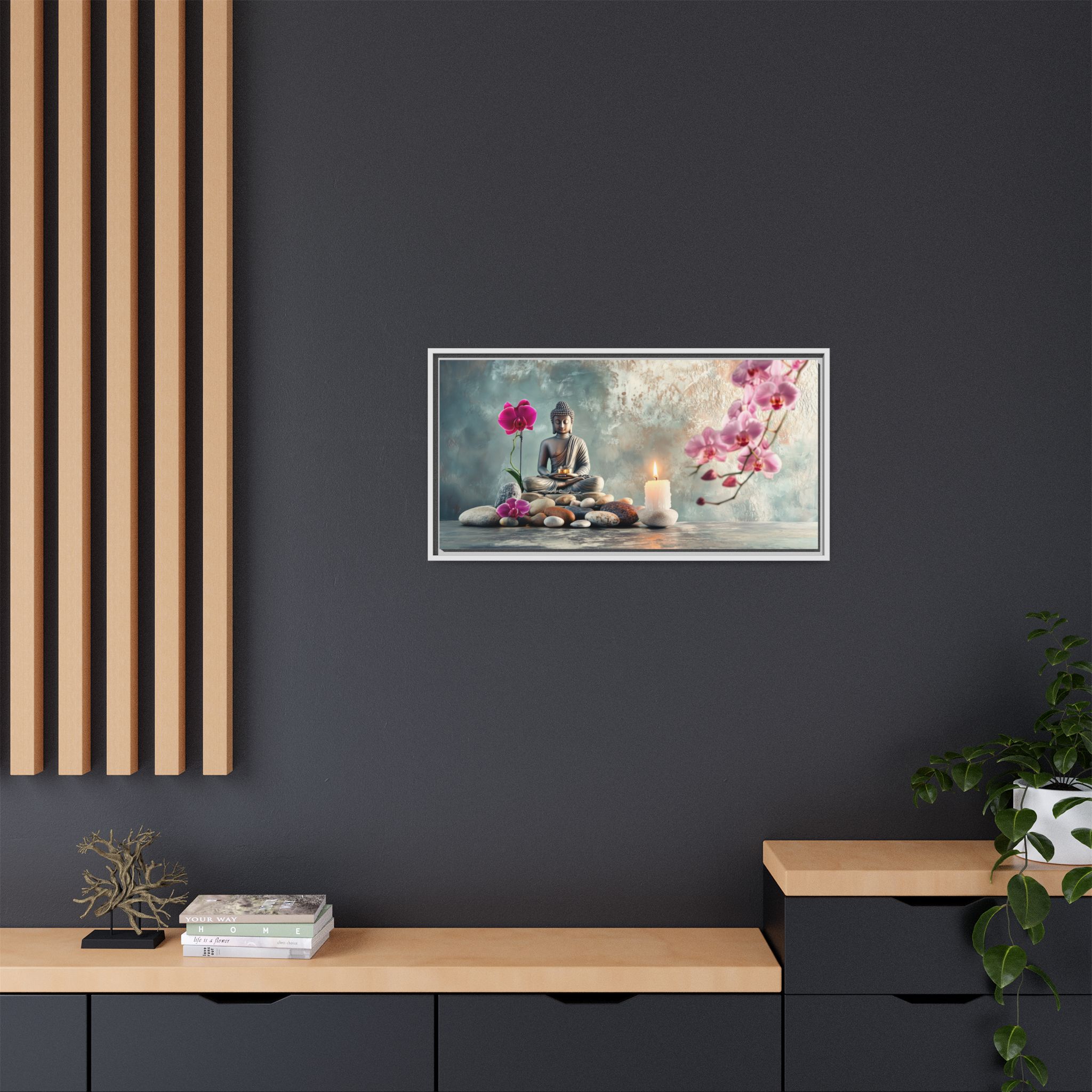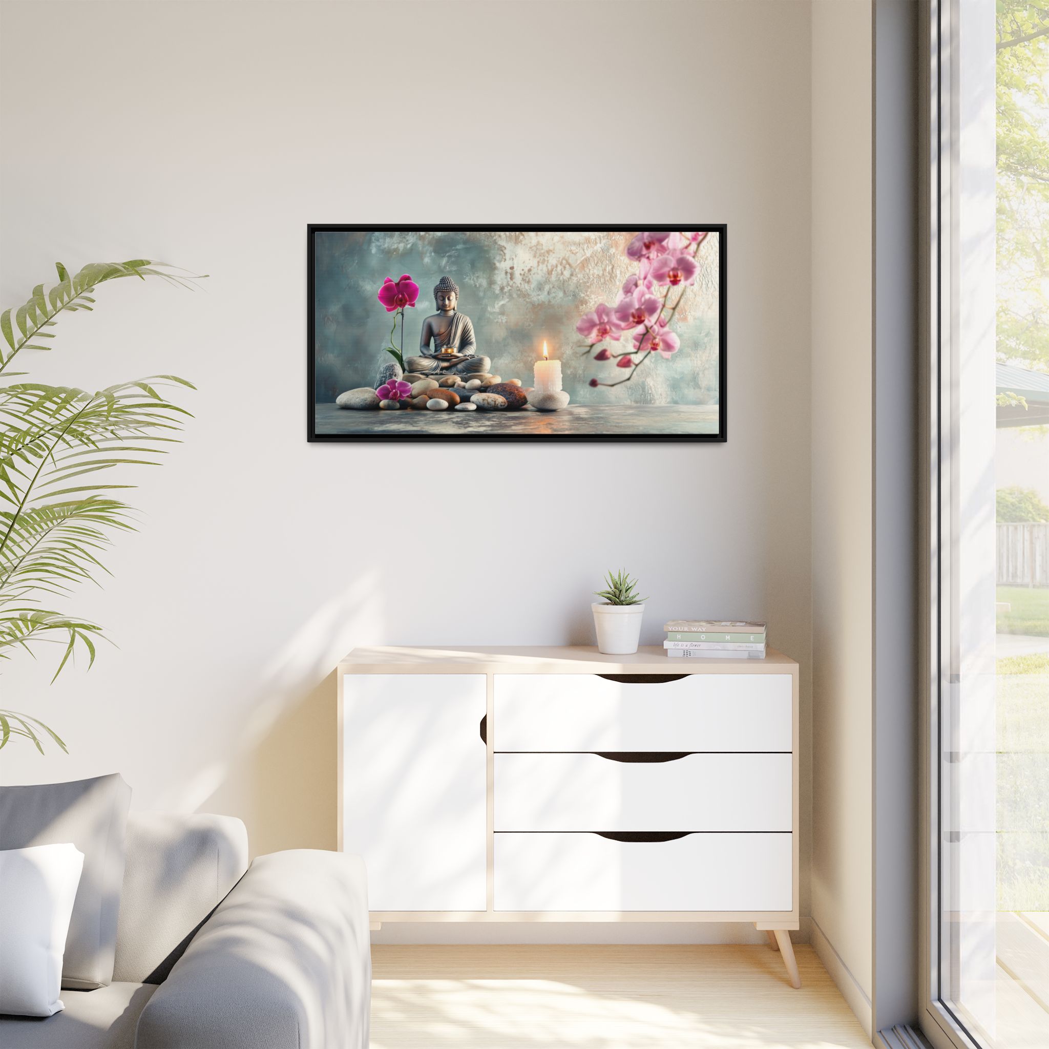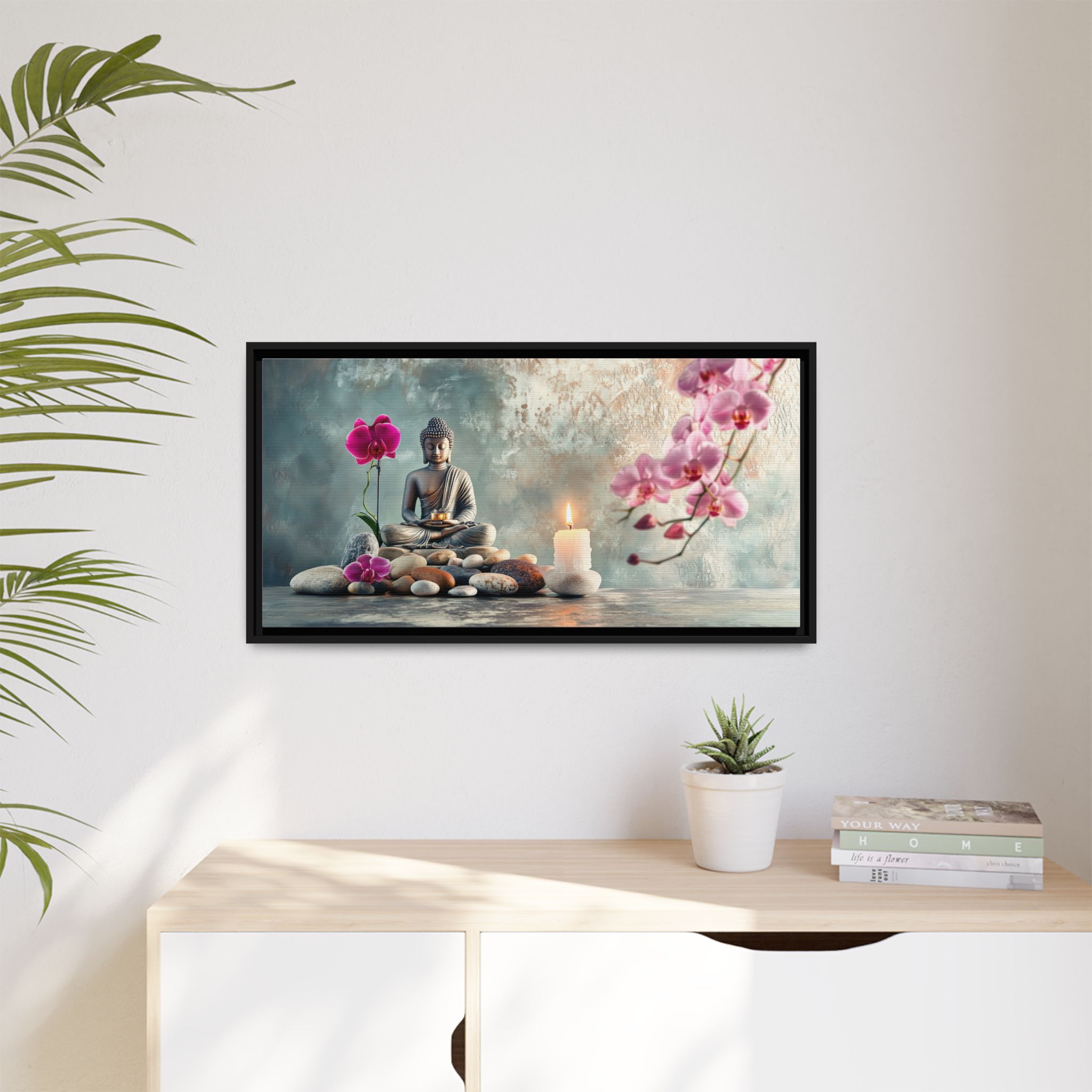 A serene canvas print featuring a purple orchid and Buddha in meditation, perfect for creating a peaceful atmosphere in any space. Ideal for those seeking inner peace and relaxation, this canvas print is relevant for mindfulness practices, meditation spaces, and spiritual decor. It makes a meaningful gift for yoga enthusiasts, meditation practitioners, or anyone interested in Eastern spirituality.