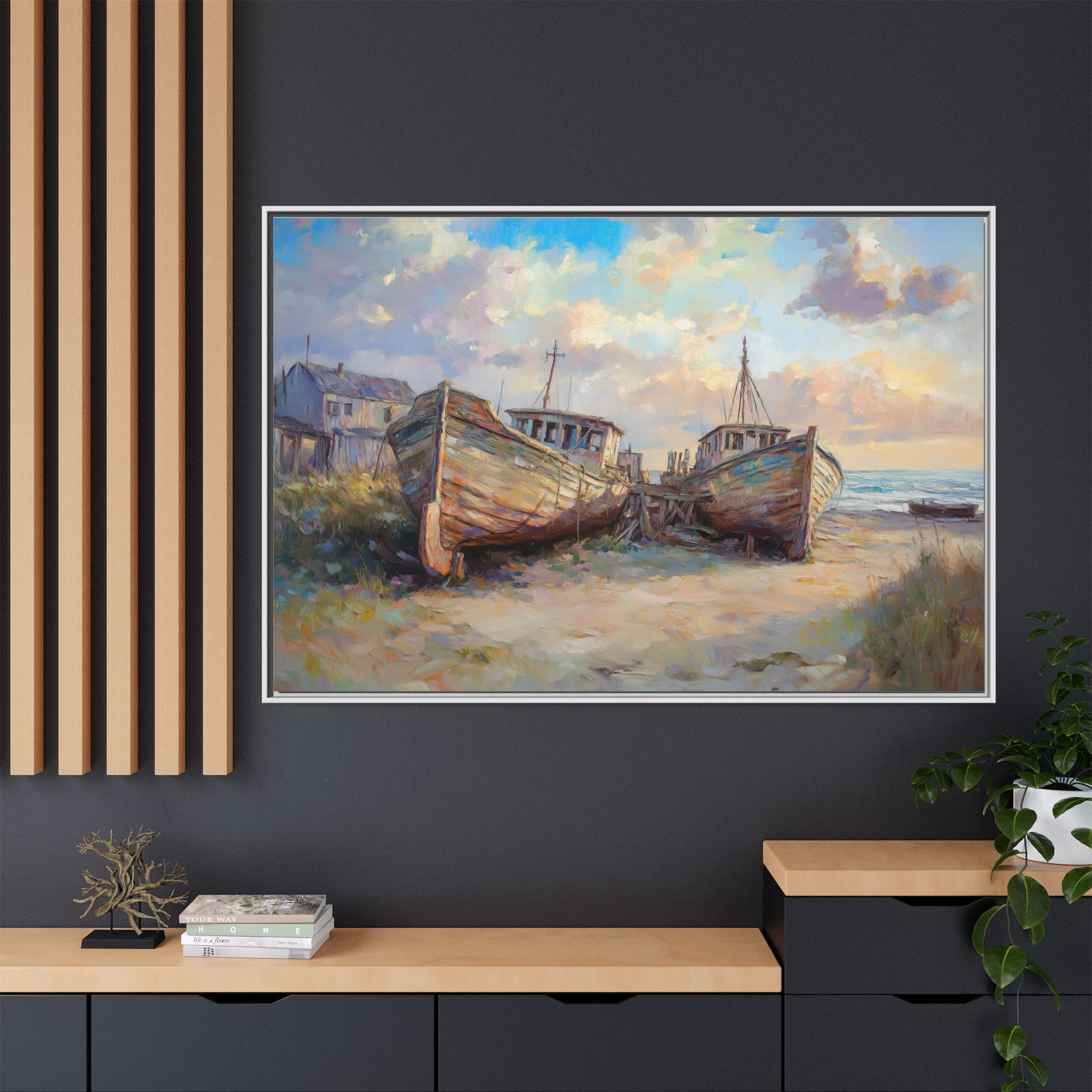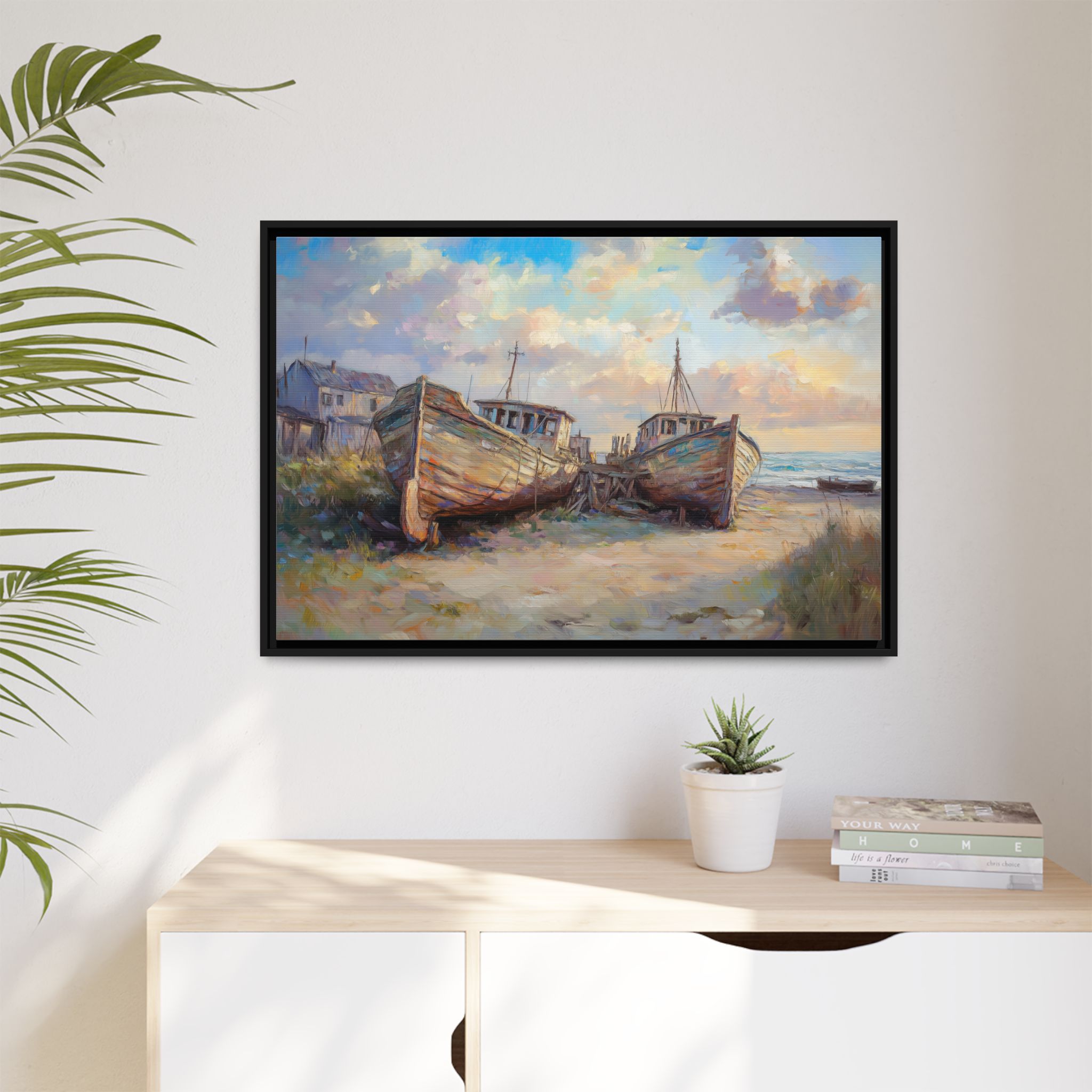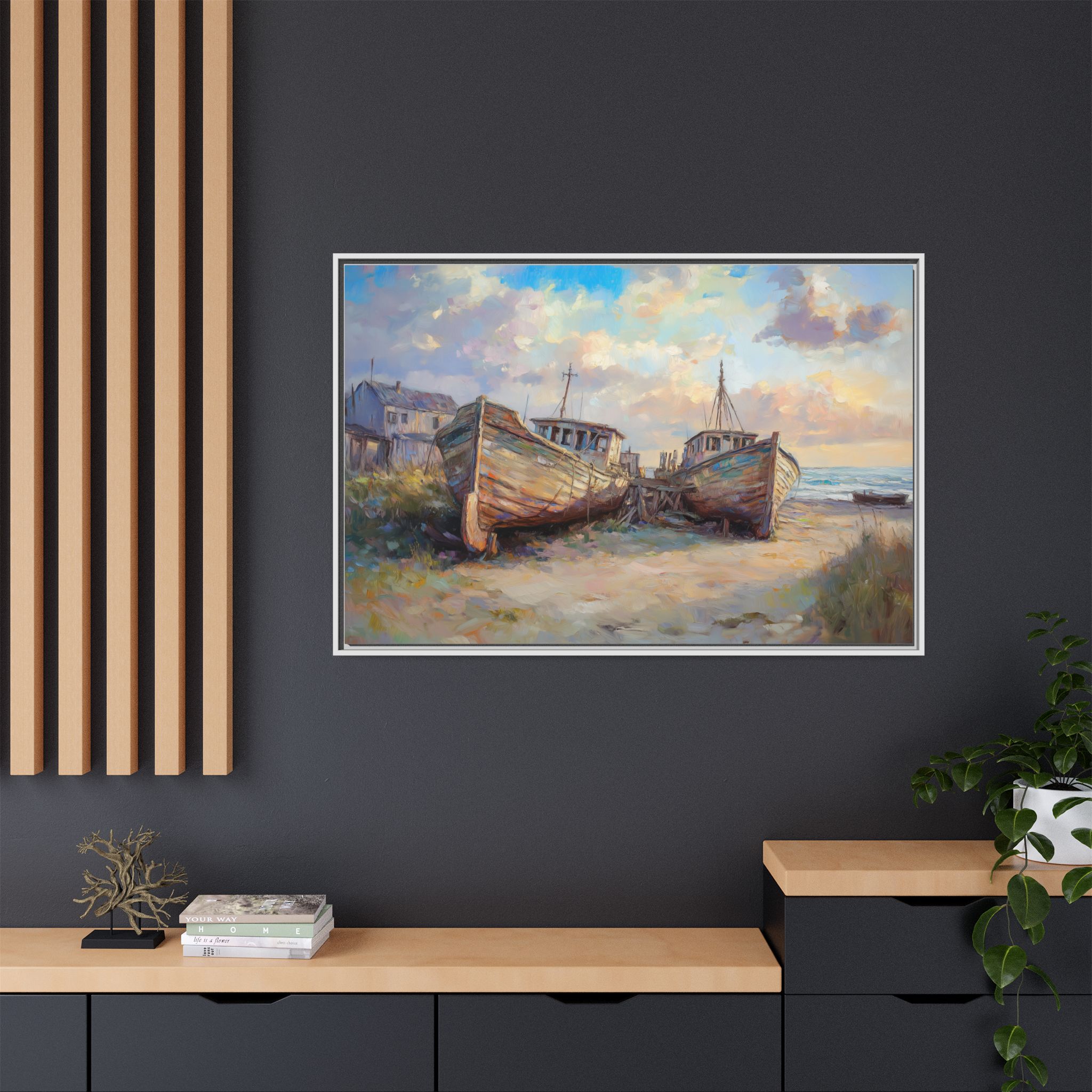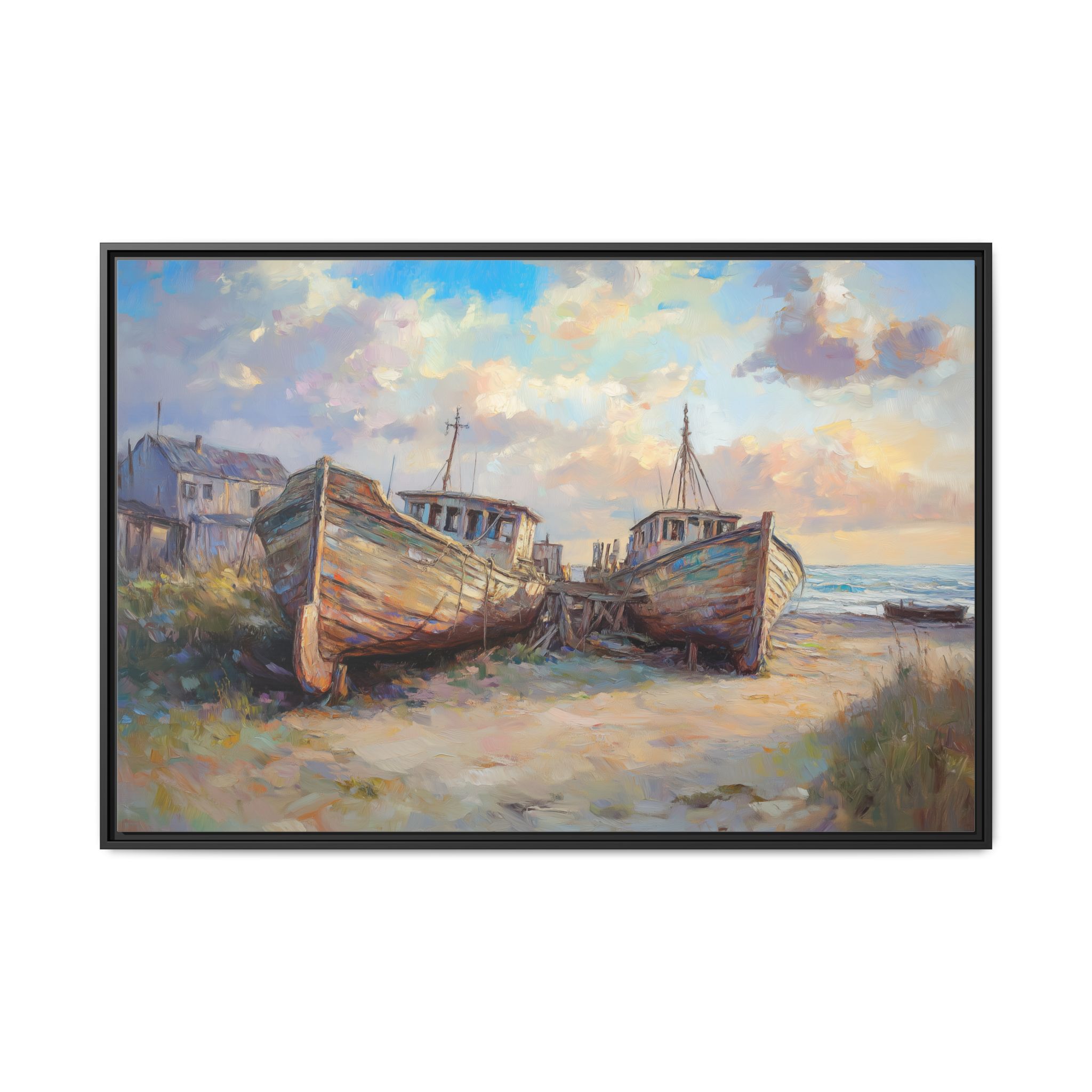 Transport yourself to a coastal fishing village with this canvas print featuring retired fishing boats. Perfect for those who love the sea and maritime vibes, this art piece can add a touch of nostalgia to any room. Ideal for coastal home decor, beach house accents, and nautical themed spaces. Great for gifts for fishermen or beach lovers, perfect for Father's Day or retirement celebrations.