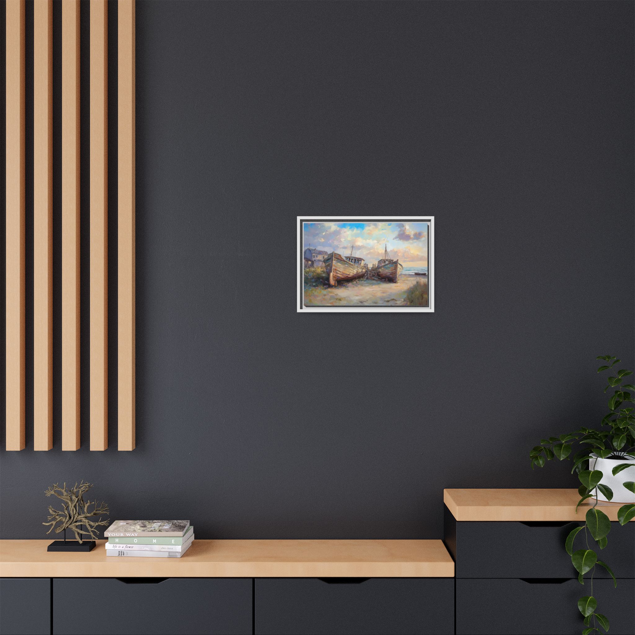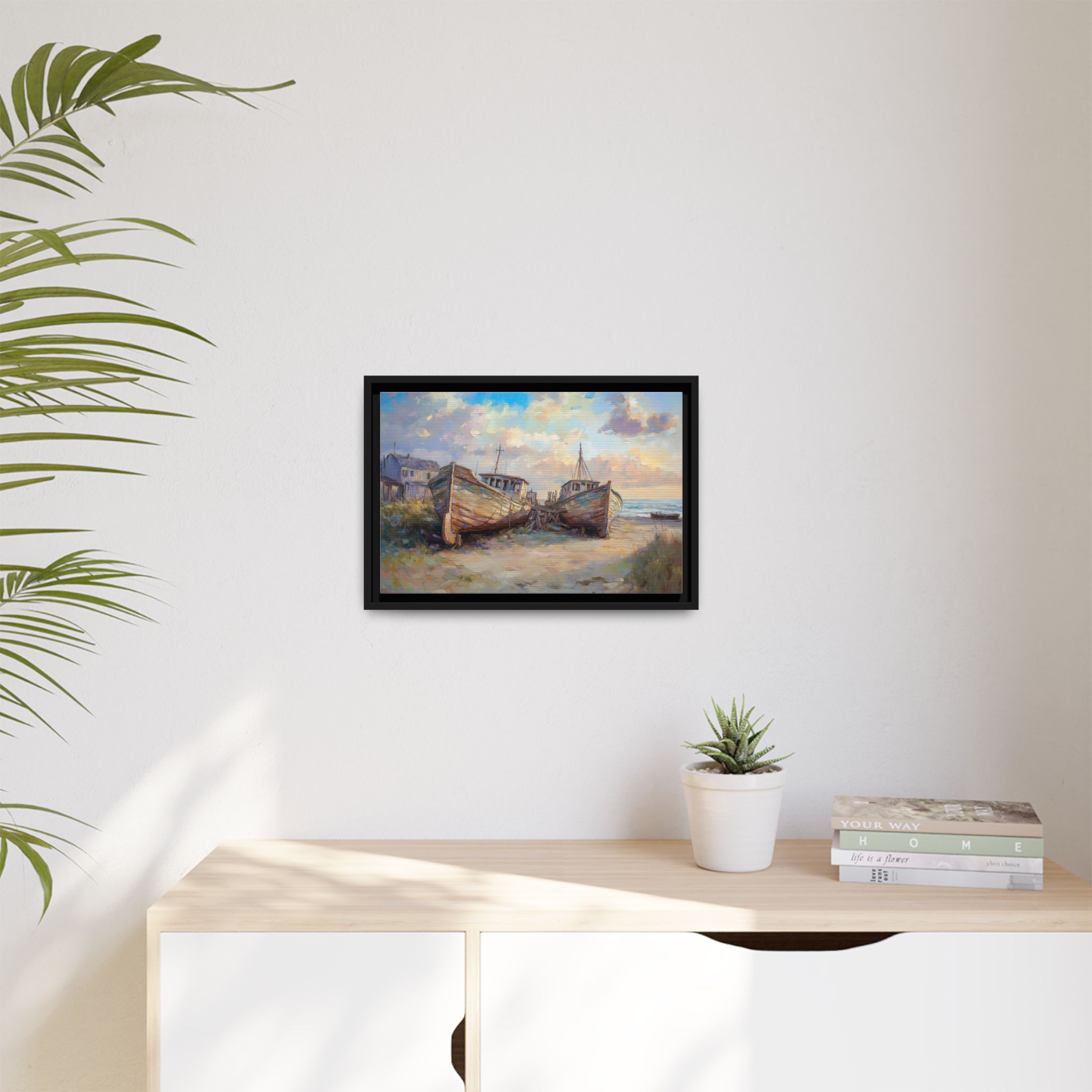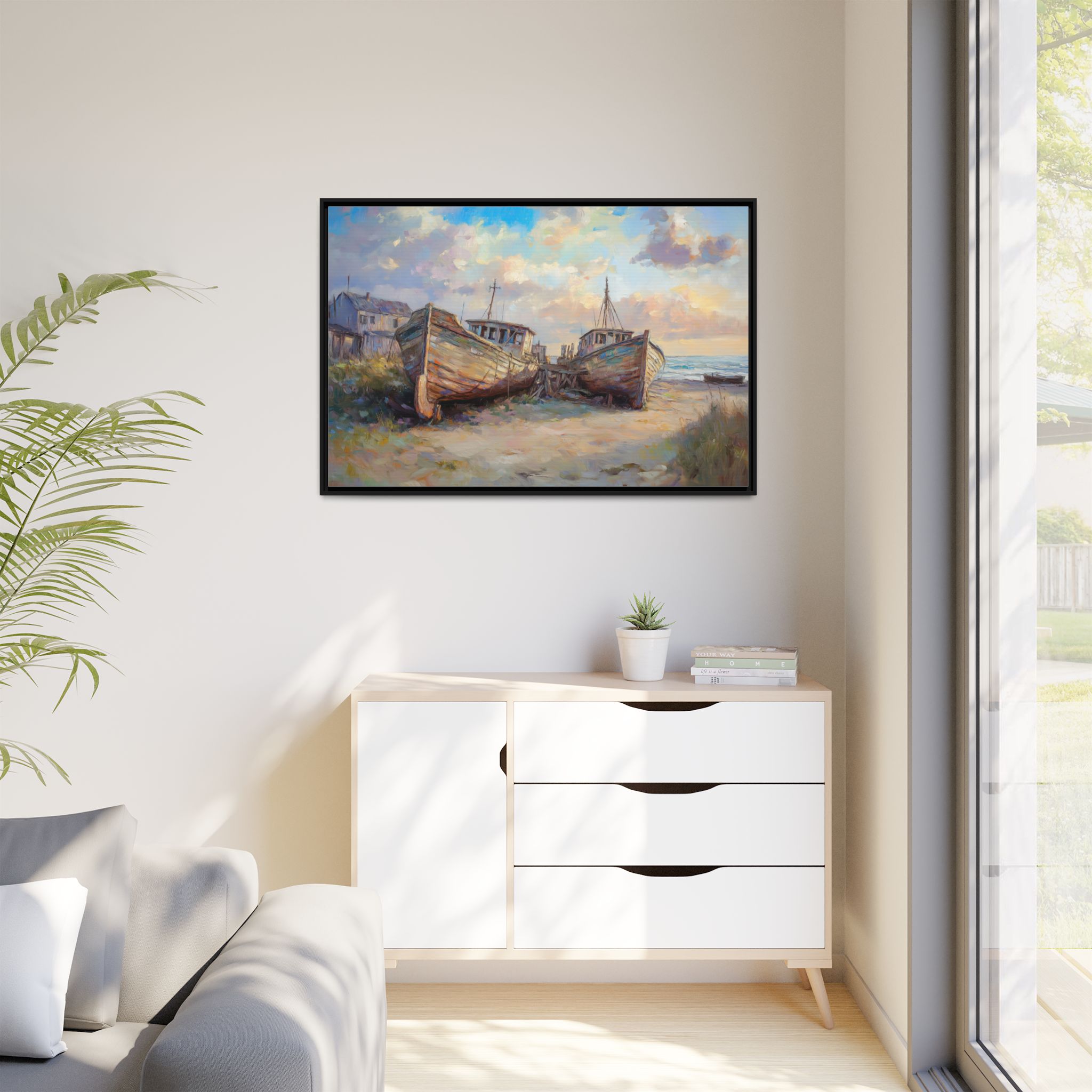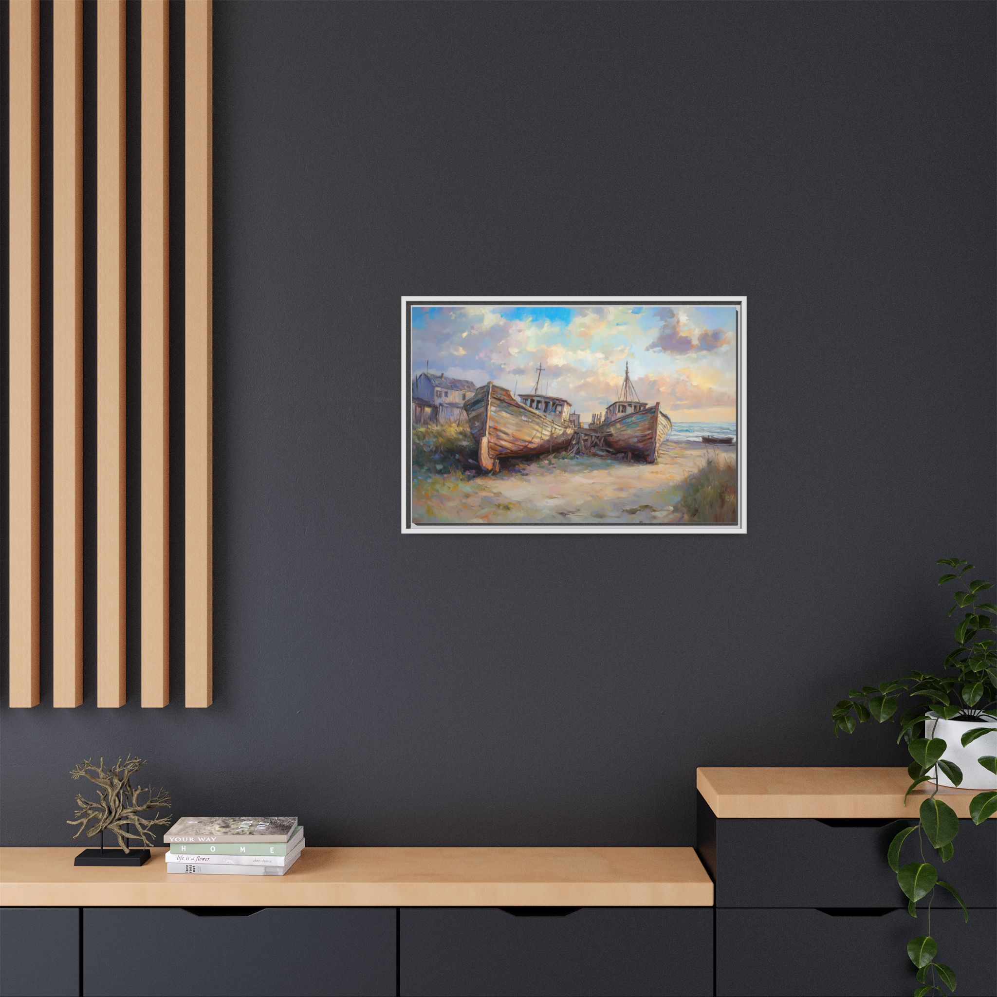Transport yourself to a coastal fishing village with this canvas print featuring retired fishing boats. Perfect for those who love the sea and maritime vibes, this art piece can add a touch of nostalgia to any room. Ideal for coastal home decor, beach house accents, and nautical themed spaces. Great for gifts for fishermen or beach lovers, perfect for Father's Day or retirement celebrations.
