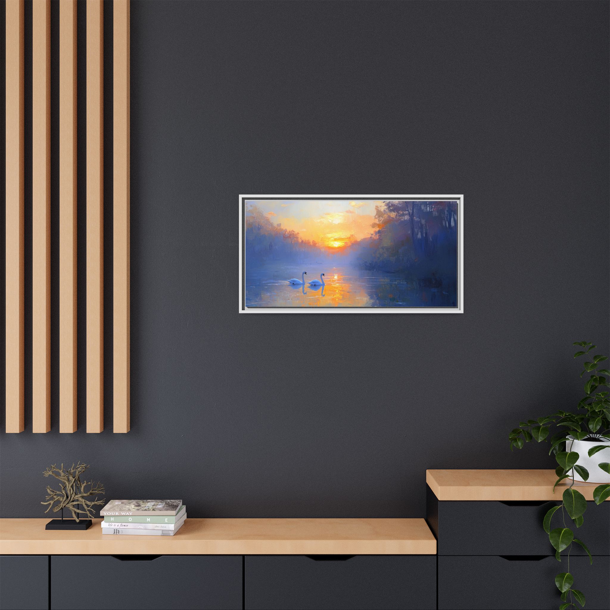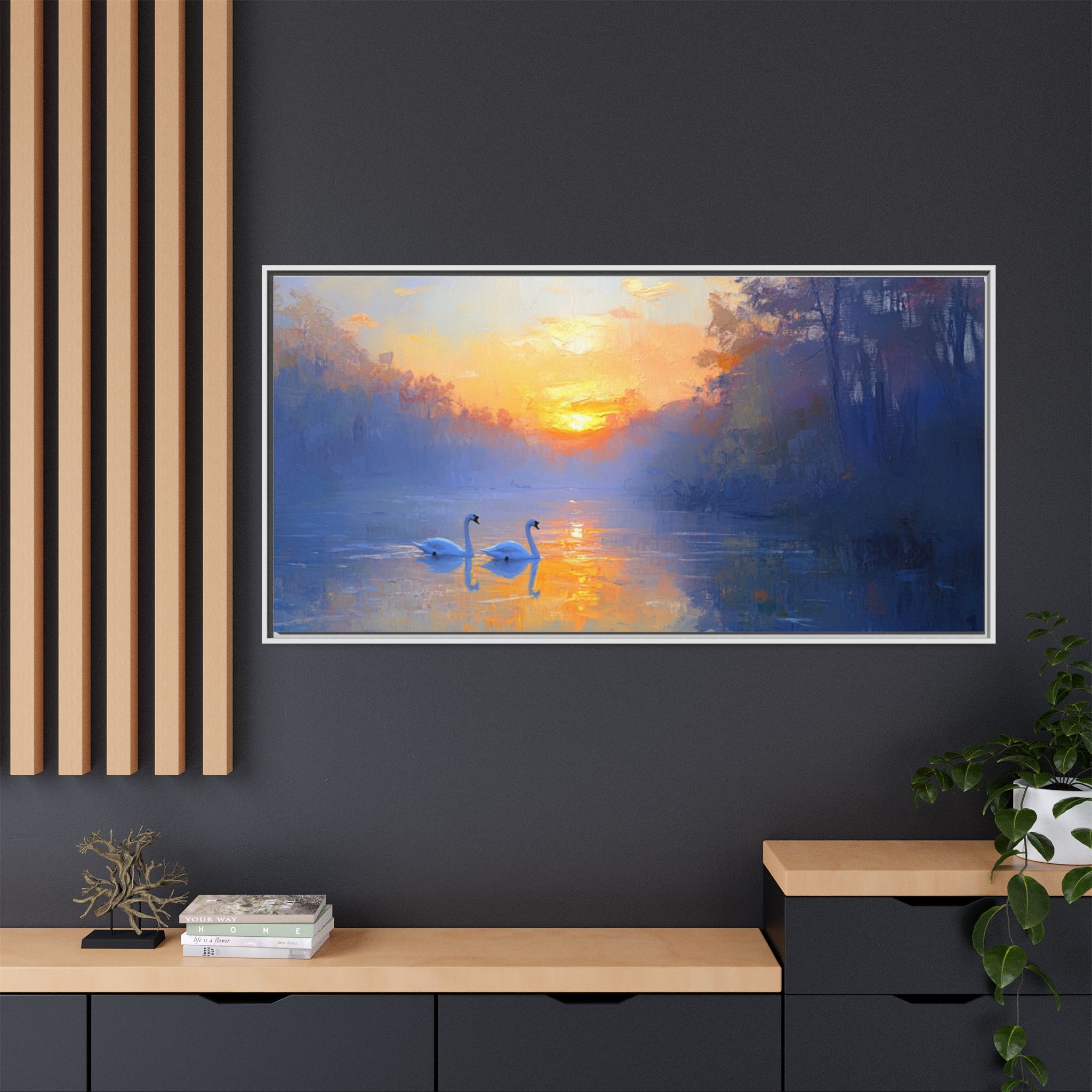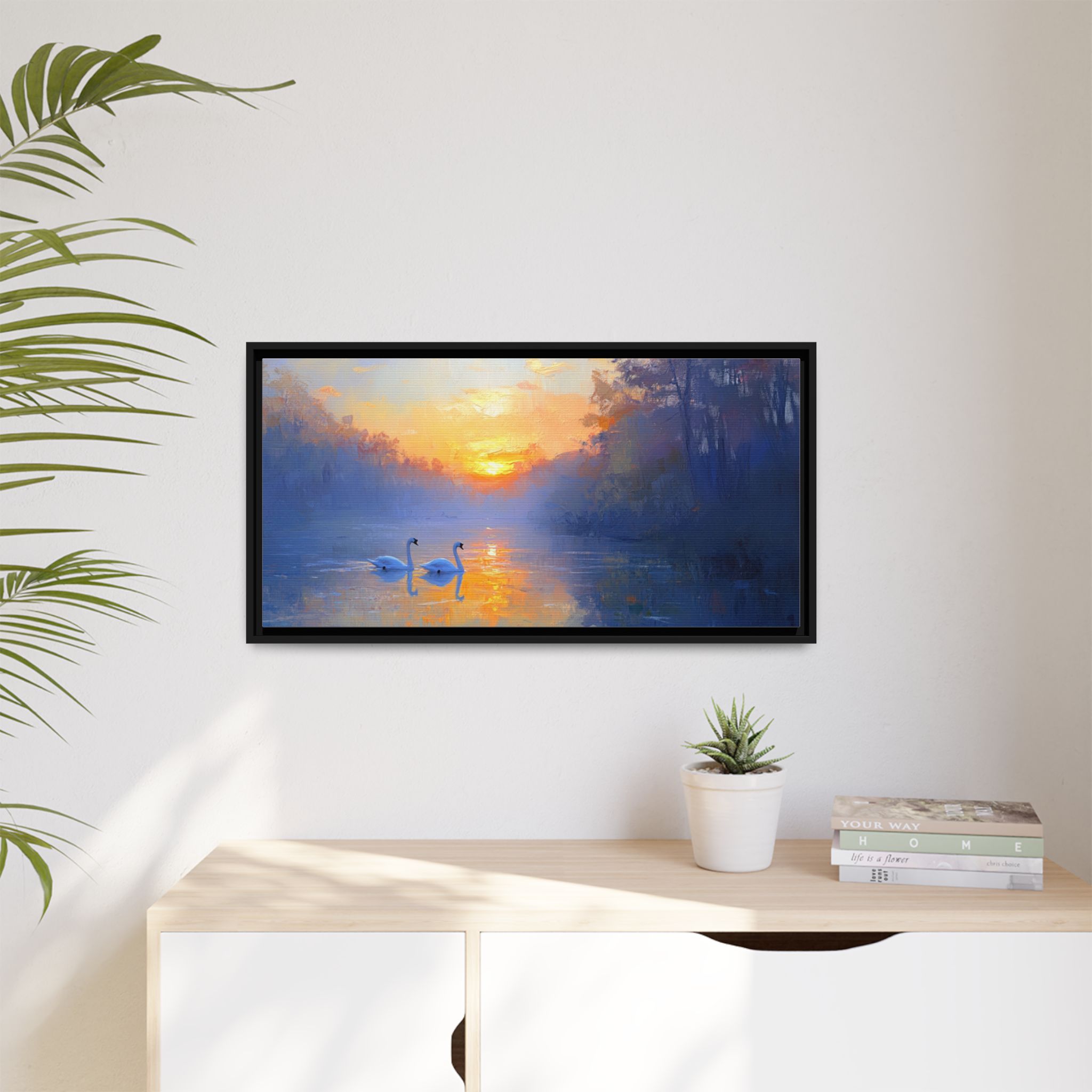 Capture the serene beauty of swans in the sunset with this stunning canvas print. Perfect for those who appreciate nature and tranquility, this piece will add a touch of elegance to any room. Ideal for nature enthusiasts, bird lovers, and those looking to create a peaceful atmosphere in their home. Great for home decor, gifting on birthdays, anniversaries, housewarmings, or as a special treat for yourself.
