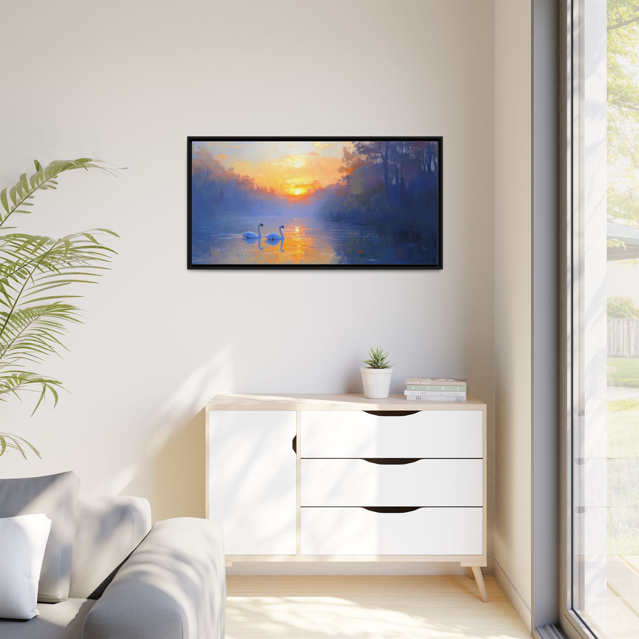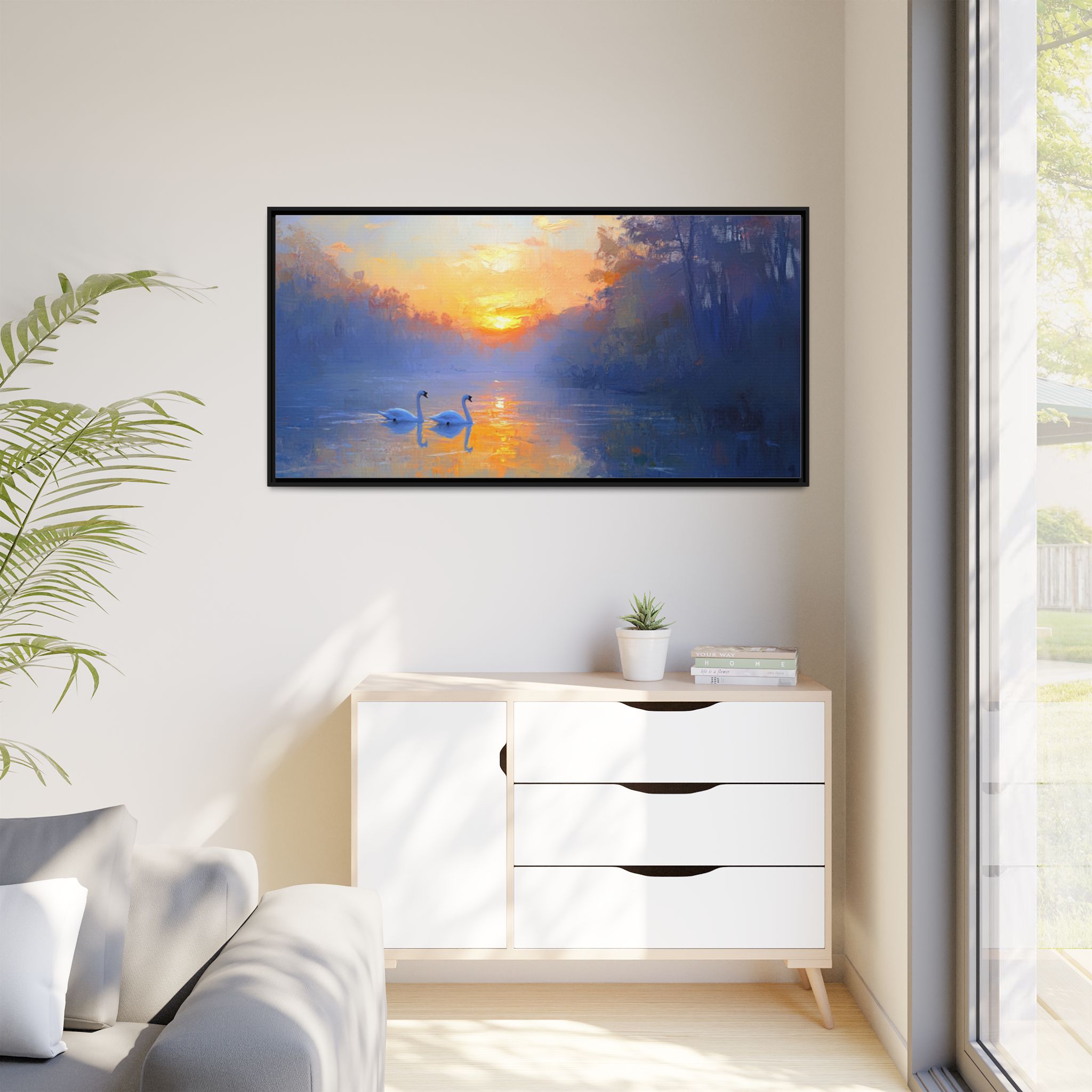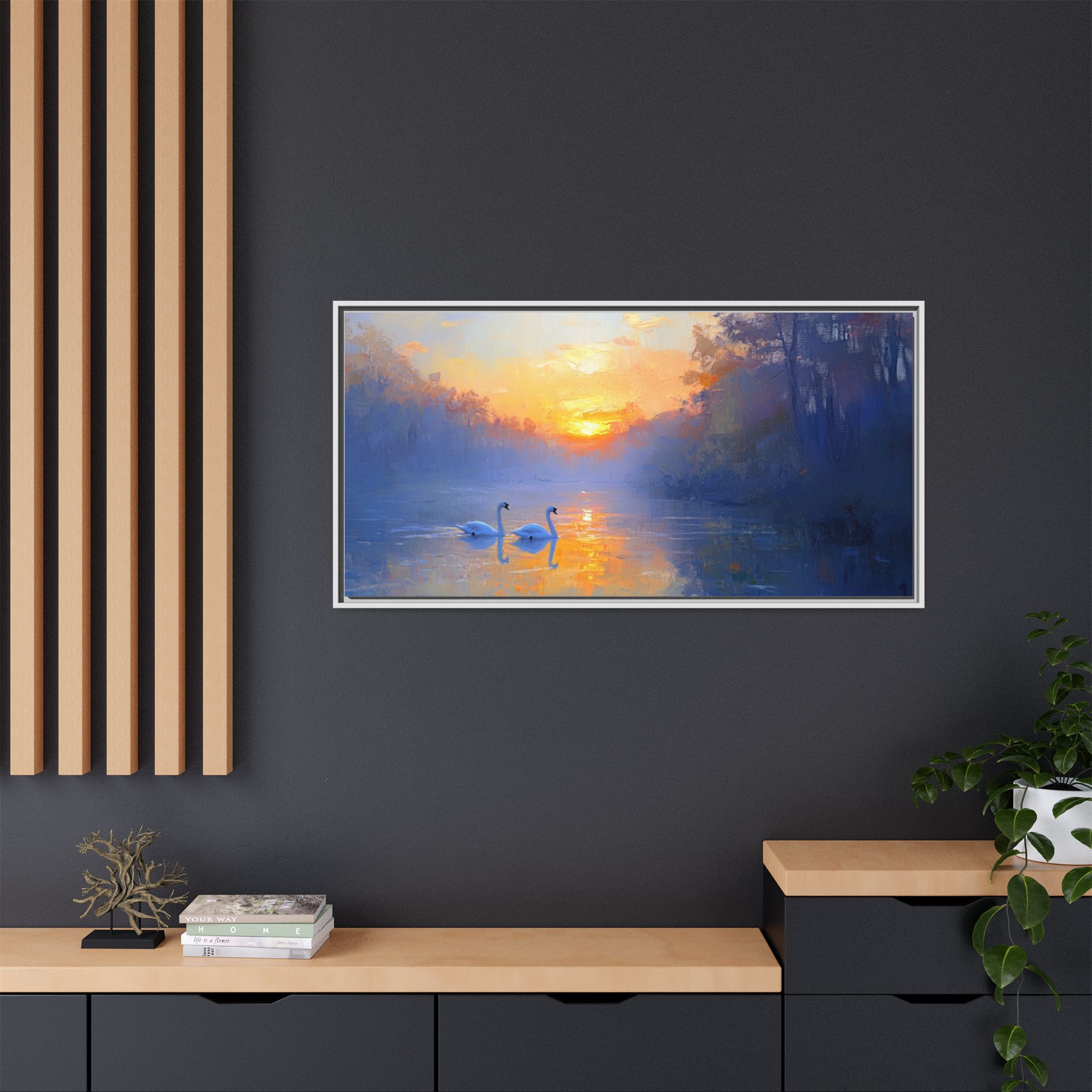Capture the serene beauty of swans in the sunset with this stunning canvas print. Perfect for those who appreciate nature and tranquility, this piece will add a touch of elegance to any room. Ideal for nature enthusiasts, bird lovers, and those looking to create a peaceful atmosphere in their home. Great for home decor, gifting on birthdays, anniversaries, housewarmings, or as a special treat for yourself.